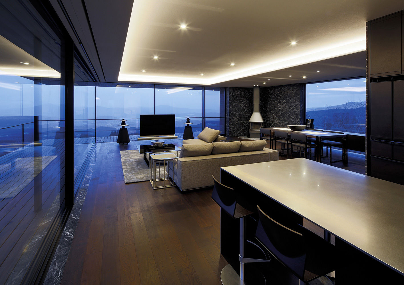 这座位于八岳山的别墅由 Kidosaki Architects 工作室设计,旨在打造与周围风景完美融合的居住空间。为了最大化地欣赏到美妙山色,整个客厅区域以悬浮方式处于山谷之上,其构造繁复精密,整体极为轻盈。客厅内放置有舒适的 Hamilton 转角沙发组合,是享受绝世美景的理想之地。此外,Bresson 与 Leger 茶几画龙点睛,赋予空间典雅特色。旁边的用餐区内则设有 Lennon 餐桌与 Bag Light 座椅。