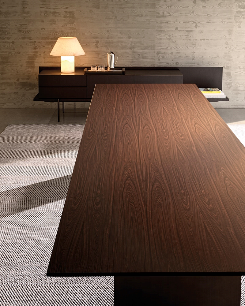 其台面非常薄,简约的线条是其特质所在,仿若雕塑般轻盈,台面周边厚度仅有16毫米,可选用Santos花梨木或深棕色花梨木,两者皆可搭配亚光聚酯漆面,也可以选择黑色漆面的白蜡木。