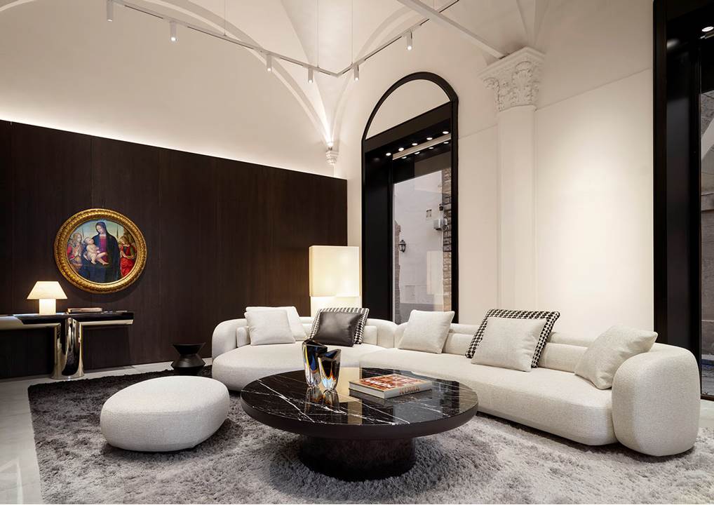 众多艺术杰作亮相其中,诠释出Giacomo Balla、Alberto Biasi、Lucio Fontana、Gualtiero Nativi等著名艺术大师的创意语言。Minotti佛罗伦萨旗舰店的现代大厅坐拥城市美景,这里摆放着一幅珍贵的16世纪圆形画作,它出自Tornabuoni Arte古典艺术藏品,在画作的映衬下,展厅与广场展开静谧的对话,并与Beato Angelico的专题展形成细腻的共鸣,将过去与当下融为一体。