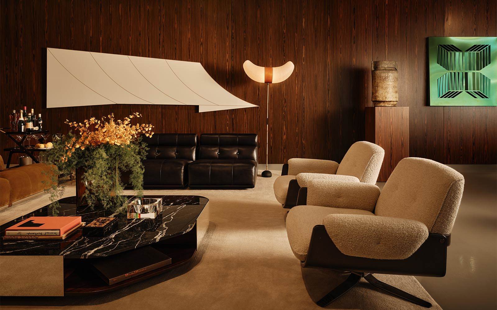 这件装置作品以富有意象的沉浸式体验为核心,将考究的材质与纹理组合在一起,探索两种不同文化之间的互动交流与动态平衡,其中,分寸与灵感共生,传统与实验并行,严谨态度与自由表达交相呼应。与此同时,这件作品旨在庆祝Minotti与当地合作伙伴Ecru Inc.二十余年的深厚协作关系,双方的稳固合作建立在共同愿景之上,多年来持续推动着品牌生活风格在美国西海岸的推广。