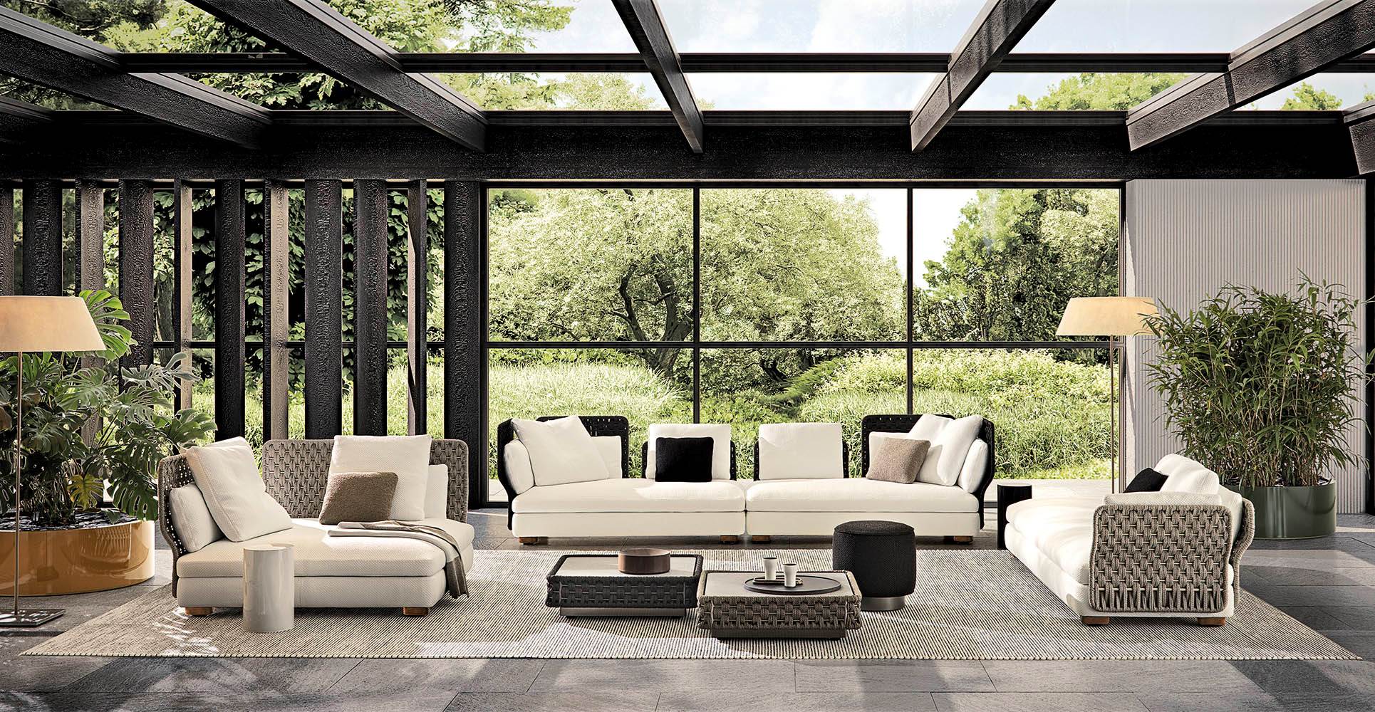 Zwei neue Sitzprogramme, die den Komfort von Indoor-Möbeln in den Außenbereich bringen, sind ideal, um Oasen der Geselligkeit und Entspannung im Freien zu schaffen: einerseits die umfangreiche Modularität von Daylight von GamFratesi mit seiner charakteristischen Rückenlehne, die wie ein umhüllender Fächer geformt ist; andererseits der verspielte Charakter von Amii von Nendo mit einer geflochtenen, eindrucksvollen Struktur, in der weiche, voluminöse Kissen in verschiedenen Formen und Größen Platz finden.