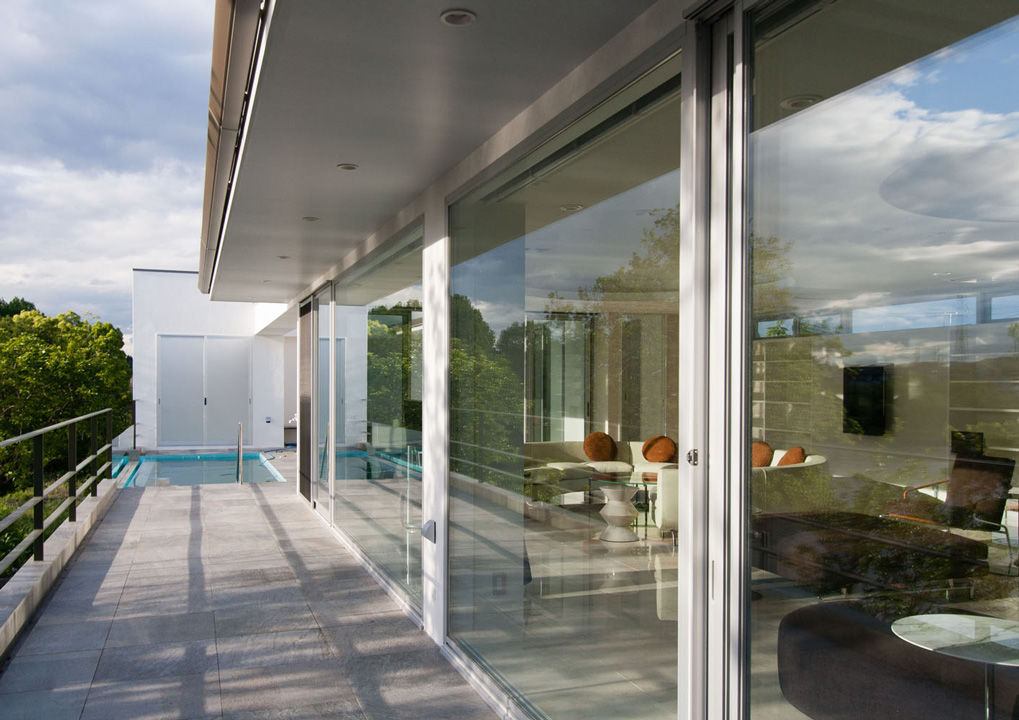 Diese, so präzise Wahl war ausschlaggebend für die gesamte Atmosphäre im Projekt und die Wahl der Materialien: Optisches Weiß für die Wände und gleichfarbiger Marmor für die Bodenbeläge. Die neutralen Farben gaben Minotti Tokyo, verantwortlich für das Interior Design, Gelegenheit, zahlreiche Objekte der Minotti Kollektionen vorzuschlagen, alle mit stark theatralischem Charakter. Im geräumigen Living mit großen Fensterfronten und Blick auf das Schwimmbad, eine bemerkenswerte, runde Komposition des Sofas Dubuffet mit den Beistelltischen Norman und Cesar, direkt gegenüber dem Fernseher. Daneben finden wir zwei Sessel Berman, eine Sitzbank Sherman und eine originelle Komposition mit Elementen des Sitzprogramms Hockney, begleitet von den Beistelltischen Kitaj und Bellagio.