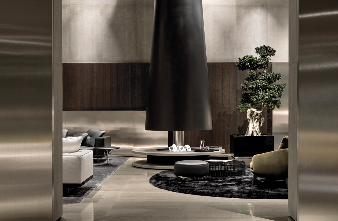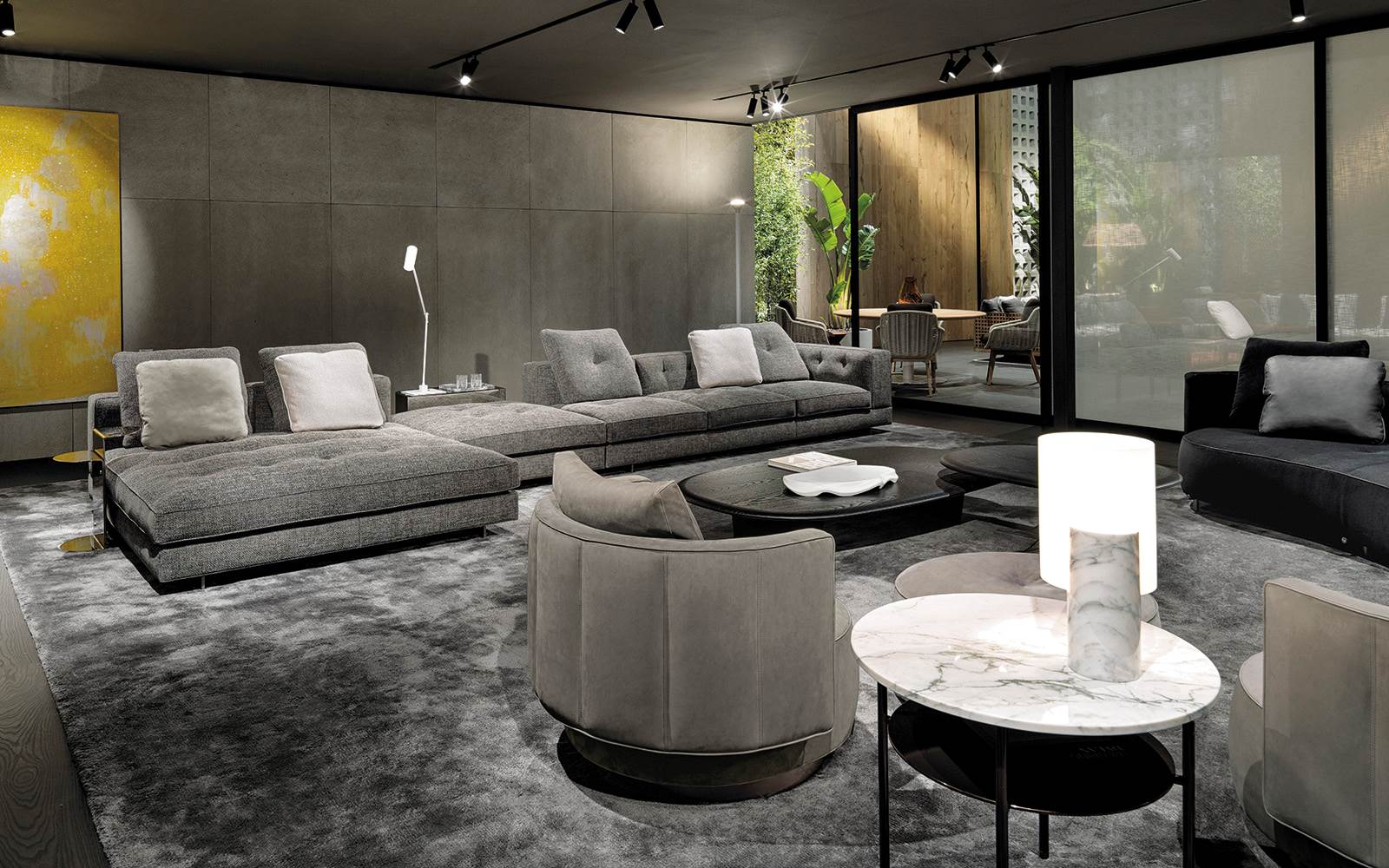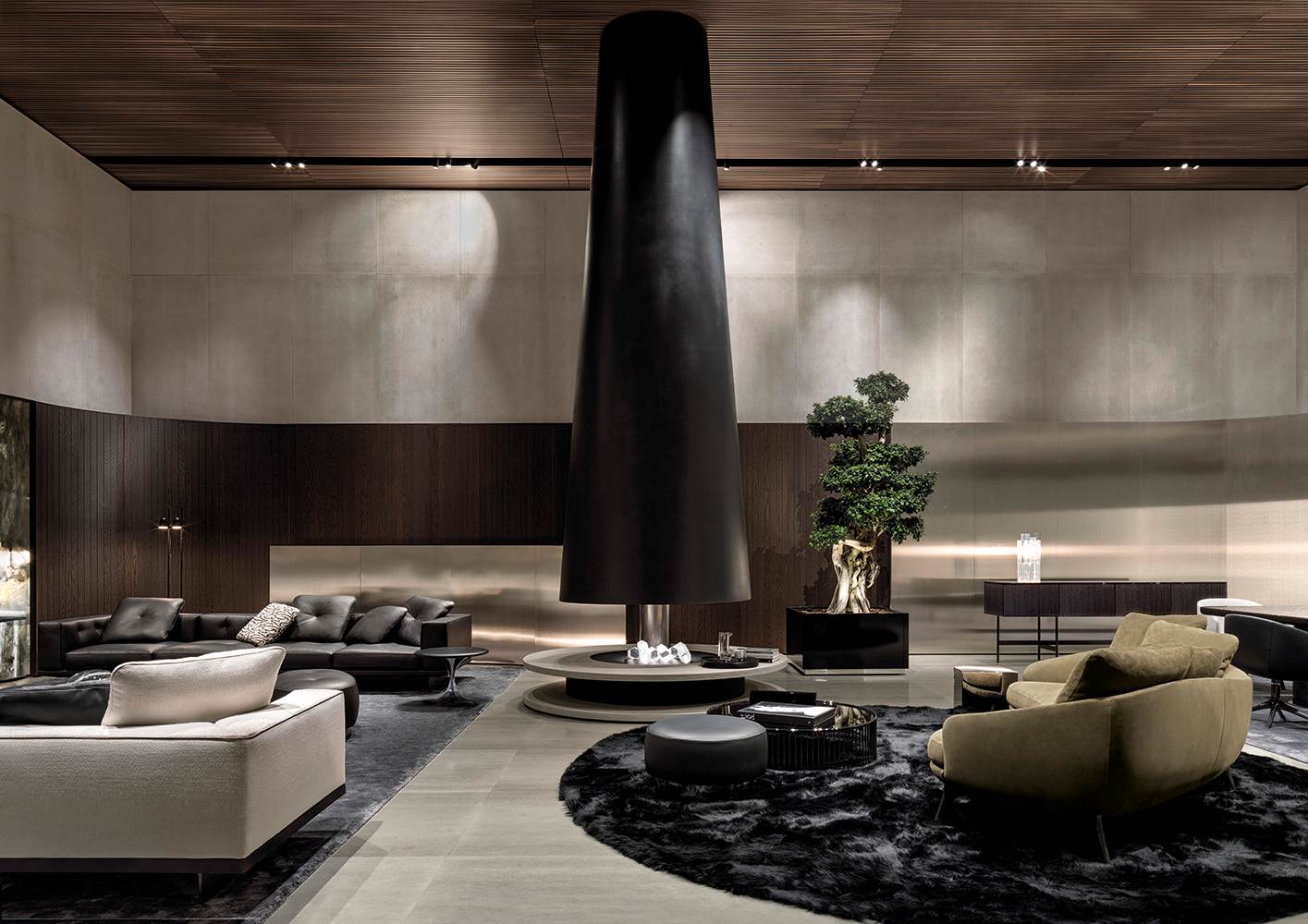 Die organischen Formen des Erdgeschosses finden sich auch auf der ersten Ebene wieder, die über zwei Wendeltreppen erreichbar ist und von der aus man das Grün und den weiten Blick in die Welt von Minotti genießen kann: Von jeder Ecke des Ausstellungsraums aus kann man die aufeinander folgenden Umgebungen entdecken, die die konstante und konsequente Entwicklung des Unternehmens erkennen lassen.