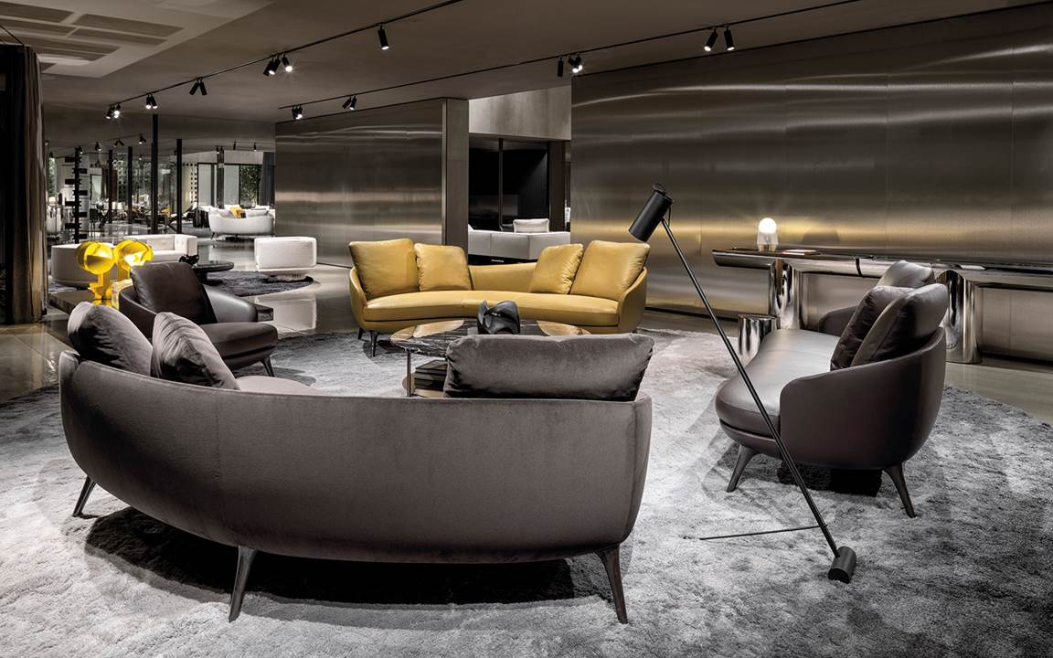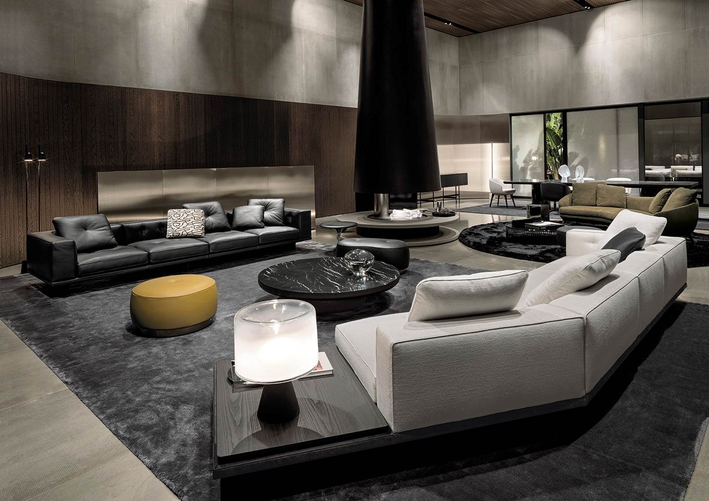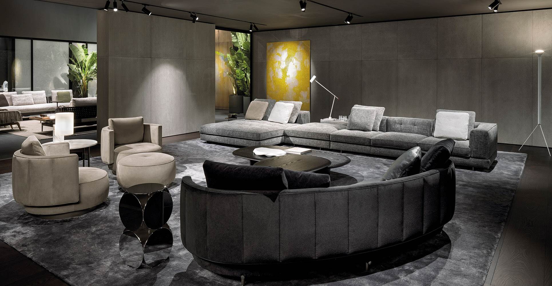 Die organischen Formen des Erdgeschosses finden sich auch auf der ersten Ebene wieder, die über zwei Wendeltreppen erreichbar ist und von der aus man das Grün und den weiten Blick in die Welt von Minotti genießen kann: Von jeder Ecke des Ausstellungsraums aus kann man die aufeinander folgenden Umgebungen entdecken, die die konstante und konsequente Entwicklung des Unternehmens erkennen lassen.