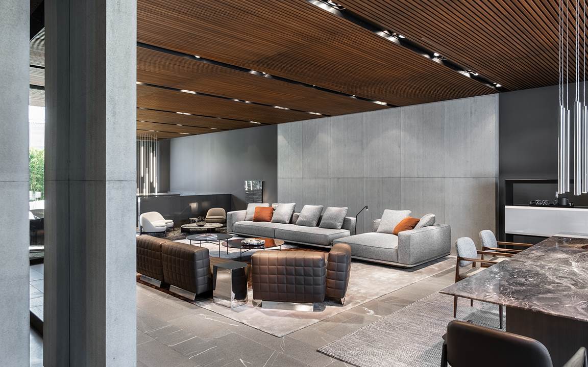 Beim Eintreten hat man den Eindruck, in ein echtes Haus zu gelangen. Materialien wie Zement an Wänden und Piasentina-Stein am Boden, warme Holzvertäfelungen in der Farbe Tabak sowie großflächige Fensterfronten bilden das ideale Ambiente für die Präsentation der Neuheiten für den Innen- und Außenbereich, Seite an Seite mit Bestsellern, den markantesten Sitzprogrammen und zahlreichen Accessoires, auch aus den jüngsten Kollektionen.