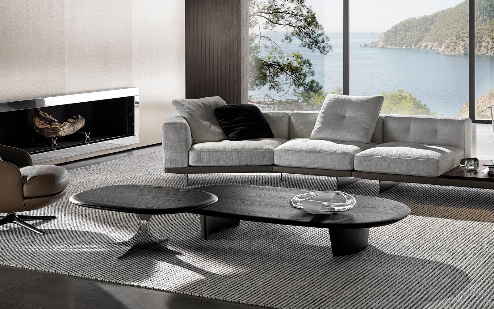 The circular or elliptical Licorice-coloured brushed ash top has edges smoothed like a river pebble, the result of in-depth technological research, and rests on the characteristic polished Chrome or Pewter metal base. The large coffee table for the centre of the lounge, on the other hand, is proposed in a single-material solid wood version, with the top resting on two curved bases, crafted with exquisite manufacturing skill.