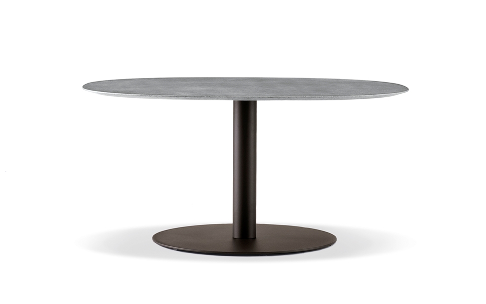 The contoured and fine-grain polished Basaltine stone version undergoes a unique stain-resistant treatment and has a stainless steel base with a polished Pewter or Bronze, matt Ecru or Dark Brown epoxy paint varnish that guarantees colour stability over time. The variant with a teak top in a natural finish has a structural stainless steel frame, varnished matt Ecru or Dark Brown colour to match the finish of the base.
