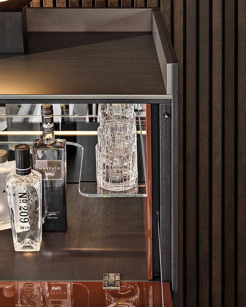 The apparent formal simplicity of Darren and its rational, accurate design conceal a piece that is far more complicated and intricately structured than meets the eye. The central element in Moka-coloured ash wood features a shelf closed in on three sides, lined with Malt-coloured satin finish aluminium strips, and stands on a base in the same finish.
