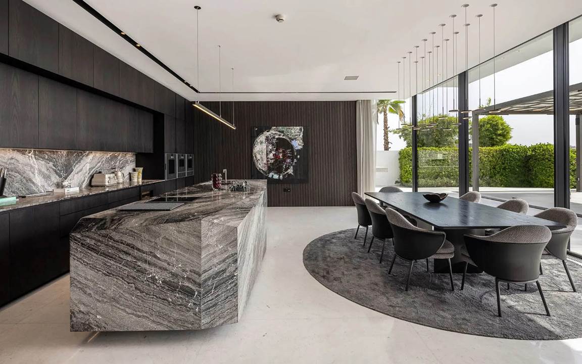The interiors feature a subtle yet sophisticated colour palette, in which marble surfaces alternate in perfect balance with warm wood panelling. The ground floor is conceived as a generous open-plan living space: double-height ceilings amplify the sense of volume, while panoramic glazing frames views of the pool and the beach. The dining and living areas flow together in a seamless, harmonious composition: in the dining space, the Shelley Dining little armchairs designed by GamFratesi blend extreme comfort and compact proportions. The protagonist of the adjacent living area is the Blazer seating system in a generous configuration, complemented by the functional Clive console table, both by Rodolfo Dordoni. The Boteco coffee table by Marcio Kogan / Studio MK27 and the Torii armchairs by Nendo complete the setting.