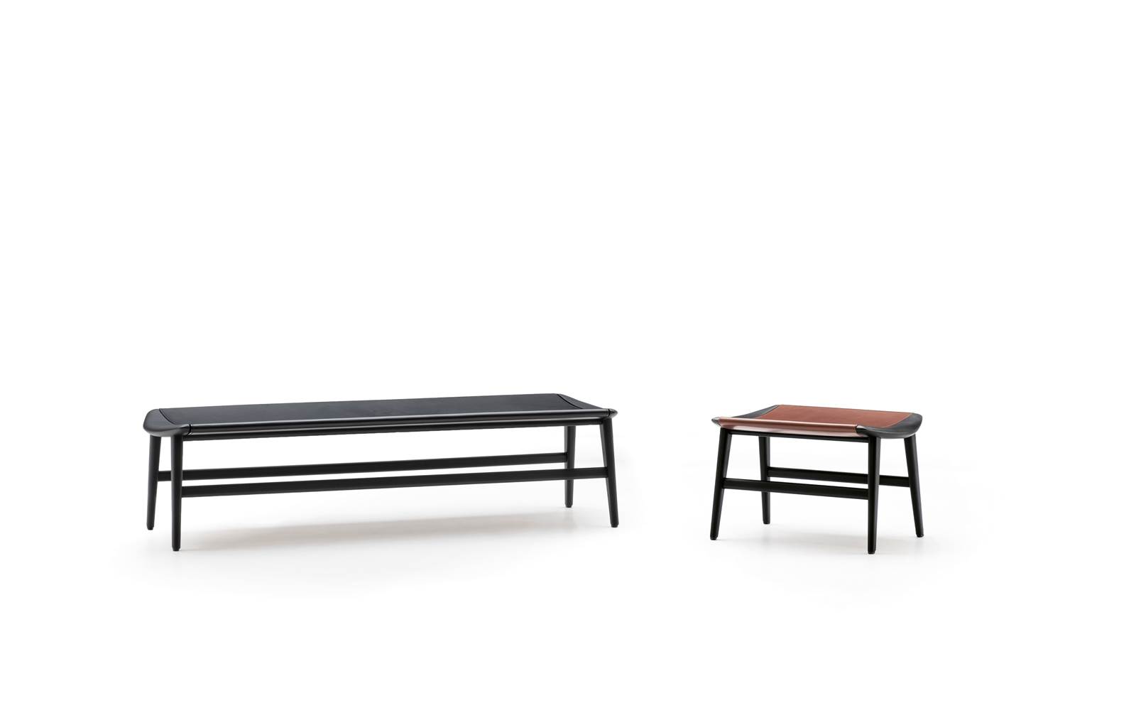The Fynn family of seats is completed by a footstool and some benches of different sizes, all with a cushion except for the benches in the Saddle-Hide version, which have a structure with a slightly concave top, combined with a saddle-hide covering that envelopes it like exquisite leather.