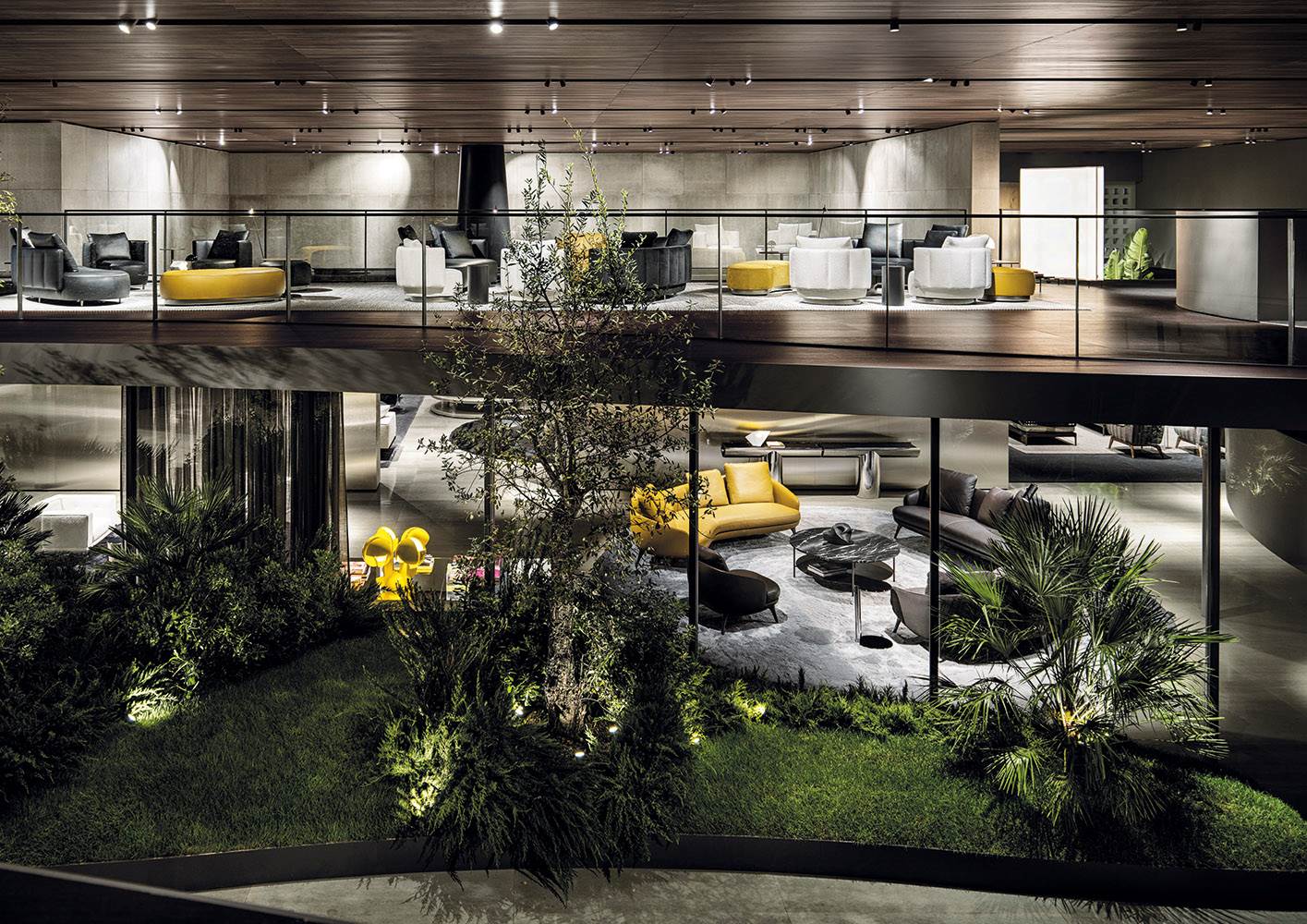 The organic shapes of the ground floor are also echoed on the first level, accessible by the way of two spiral staircases, looking onto the green surroundings and the wide-open view as far as the eye can see into the world of Minotti: from every corner of the exhibition space, one can perceive the environments that follow one another, recounting the company’s constant and steady evolution.