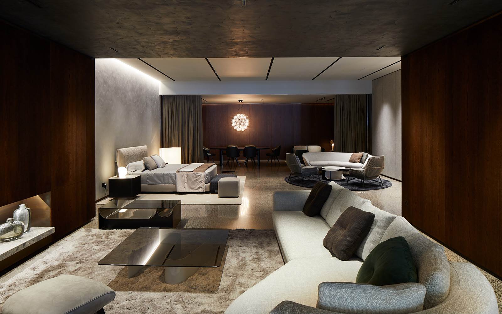 The retail project results from the collaboration of the interior design team at Minotti with the New Zealand-based interior designer Rufus Knight: a total surface of about 180 sqm., including a cozy outer space of 36 sqm. enlivened by a Quadrado modular system and its complementary pieces. A huge wooden branded wall welcomes visitors into the classy venue and invites them to explore the space through a succession of evocative indoor sets with different thematic corners.