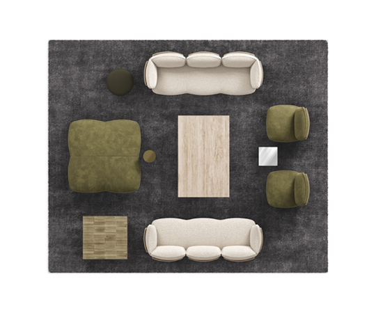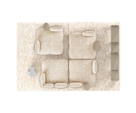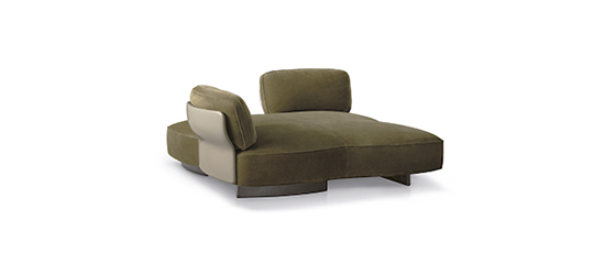 The square island version, whose surface is enriched with stitching that intersects at the centre, is particularly inviting and can be used as a spacious seating area where multiple people can lie out or sit along its perimeter, in lounge, residential, or Hospitality spaces.