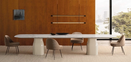 The sculptural base gives this table a strong identity, recalling the sinuous design of the Saki family of seats.
