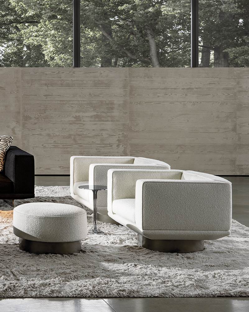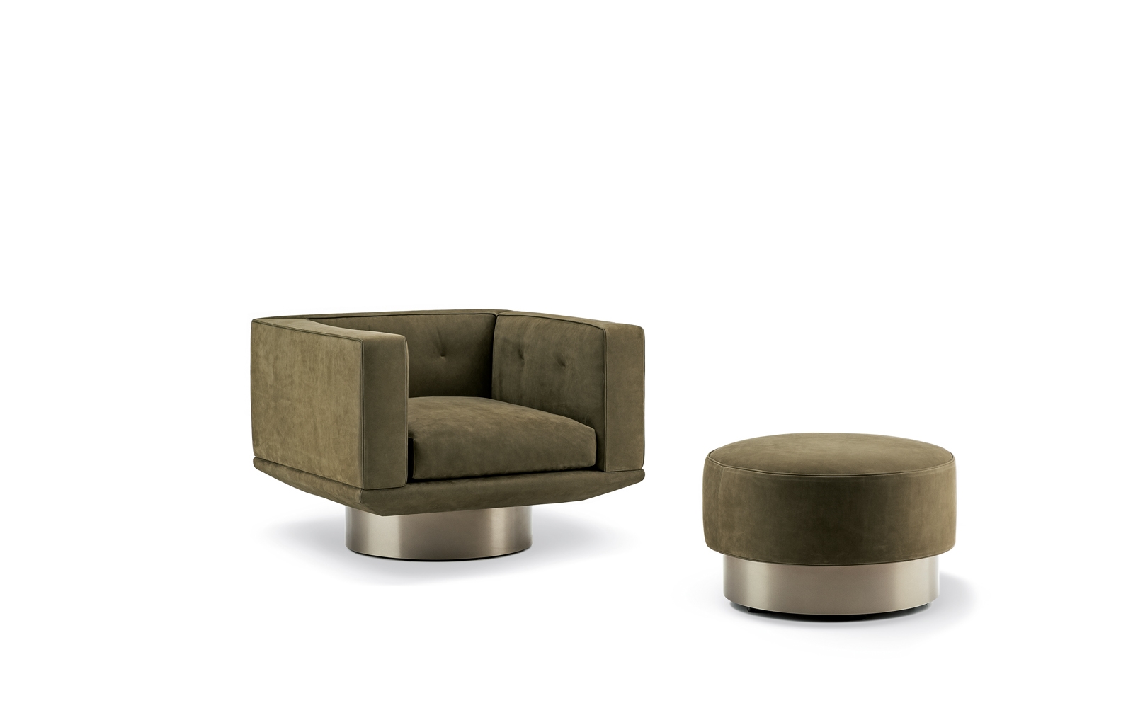The metal base, available in Bronze or Polished Chrome finishes, faithfully reflects the identity of the armchair and lends the ottoman an architectural and sculptural presence. Also available in a wheeled version, it is easy to move and further expands its functionality, making it a practical and multifunctional piece.