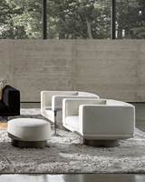 The cylindrical shape, soft and perfectly proportioned, offers a comfortable seat suitable for multiple uses within the living space: as a support surface, a decorative element, or a natural extension of the armchair. The padded structure, compact and enveloping, enhances the volume of the ottoman while preserving a clean and contemporary line.
