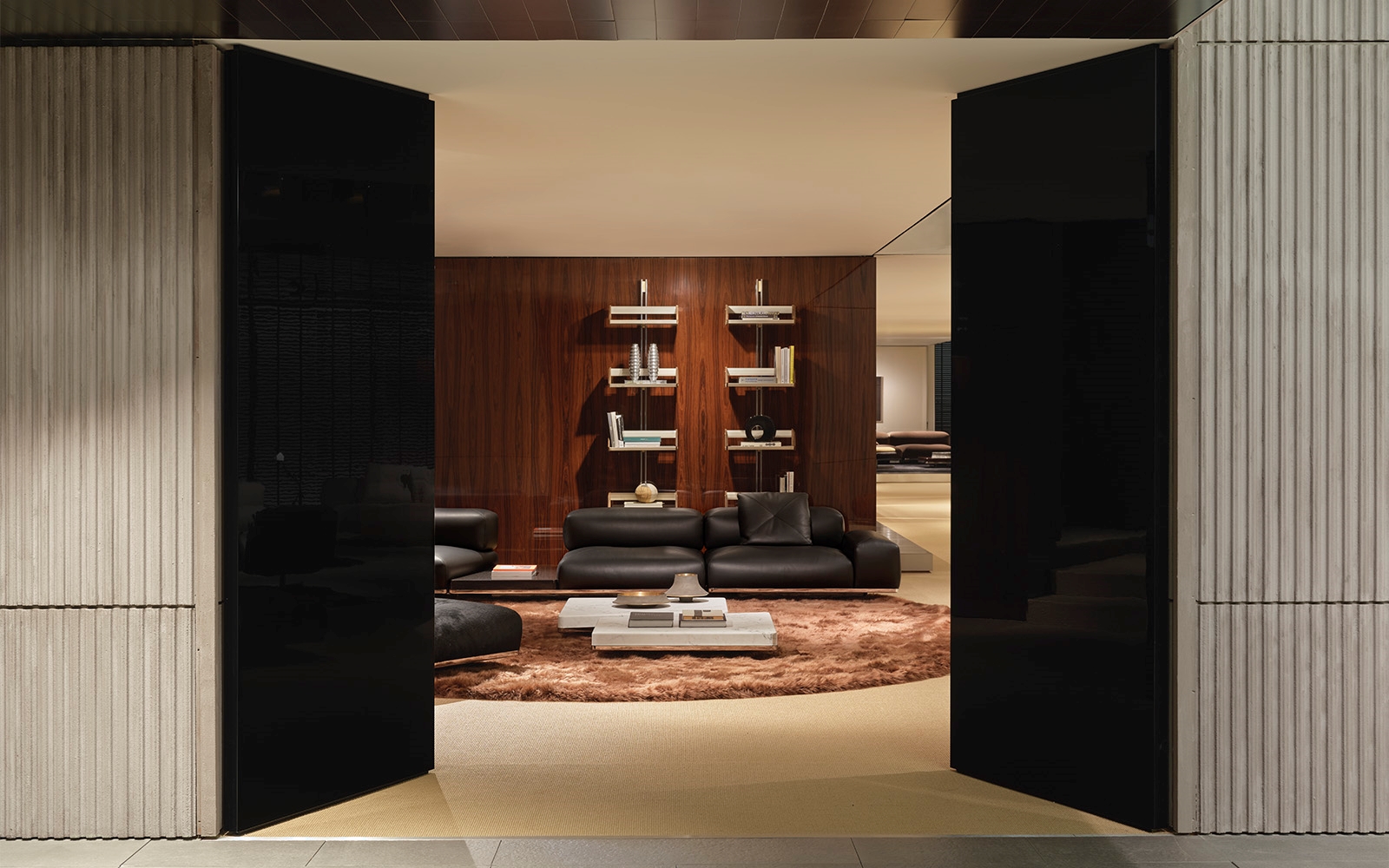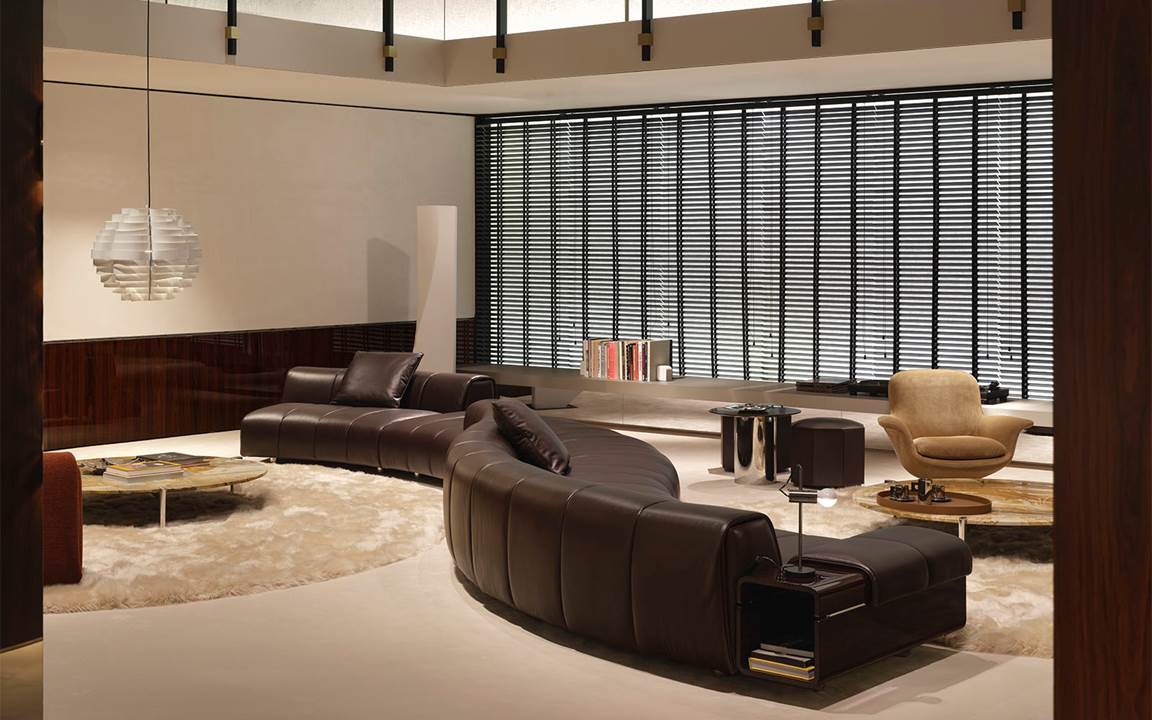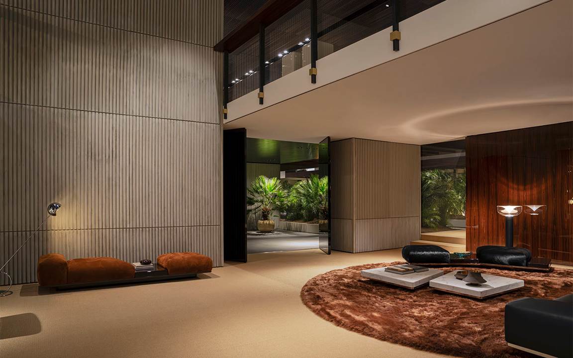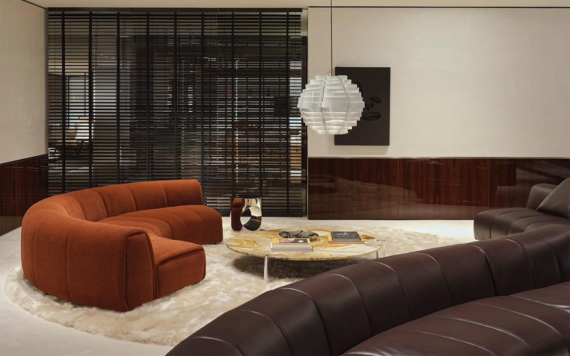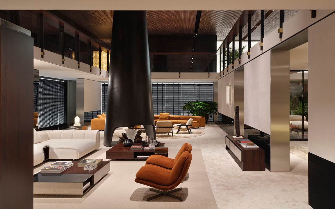 On the exterior, the interplay between exposed concrete and Dark Brown palisander defines its bold, distinctive character, while inside, the Minotti Pavilion unfolds as a continuous sequence of double-height spaces, shaped by refined material and colour contrasts, with openings and perspectives that echo the architecture of the 1970s and 1990s —the design imprint of the collection.