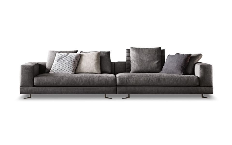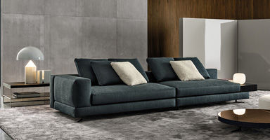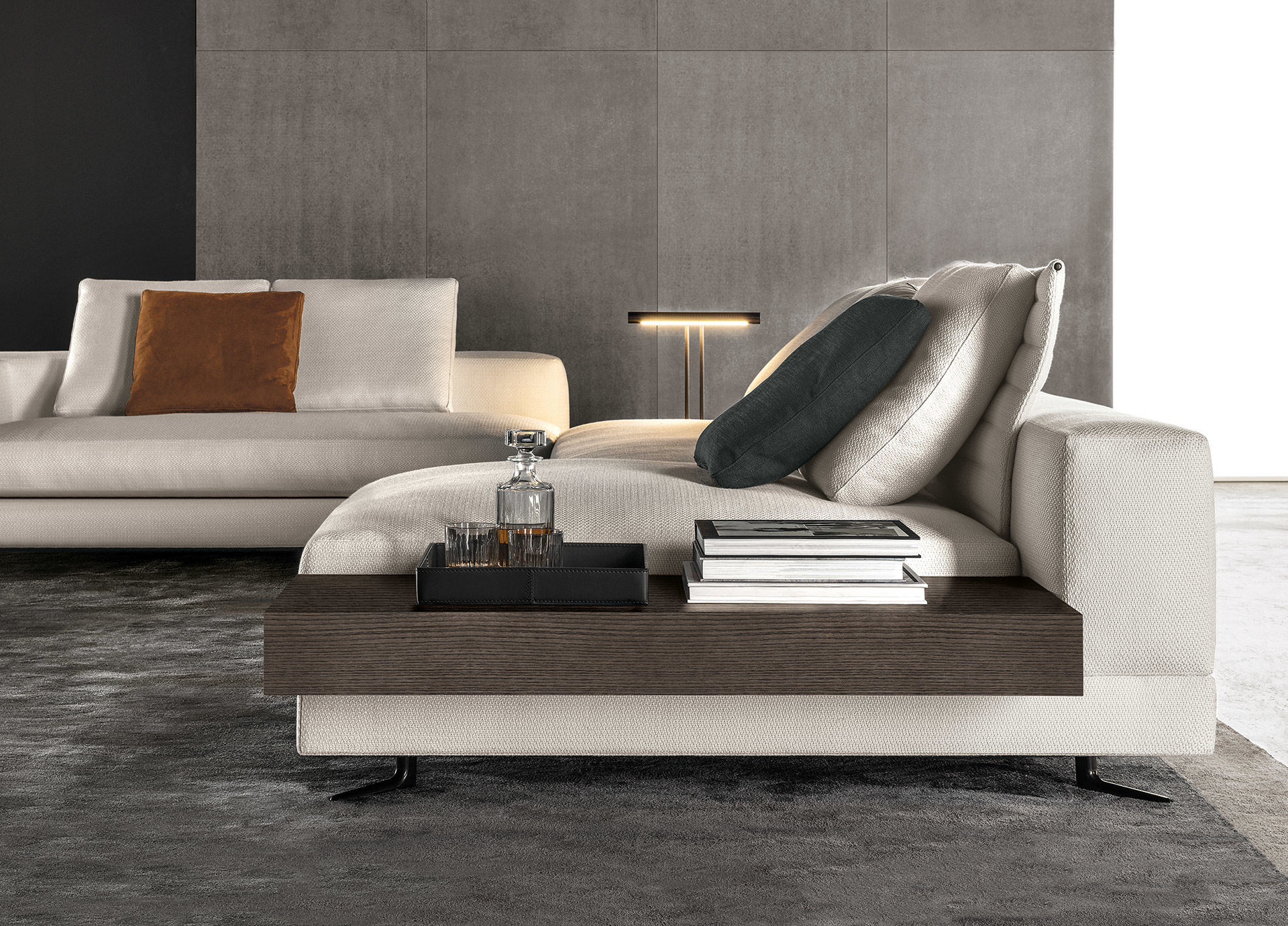 The sofa base can be upholstered in fabric, leather or saddle-hide upon which the seat backs, cushions and tray tops are placed to create a captivating interplay of shapes and alternating positive and negative spaces. The sofa sits on die-cast aluminum Pewter-colored feet, an exclusive design by Minotti Studio, that are set at a 45° angle to the sofa corners, lending added flair, even to larger-sized compositions. To make the White sofa even more welcoming, the padding in the cushions was enhanced with a deeper layer of goose down, making them luxuriously soft and creating a pleasant contrast to the sleek formality of the sofa base.