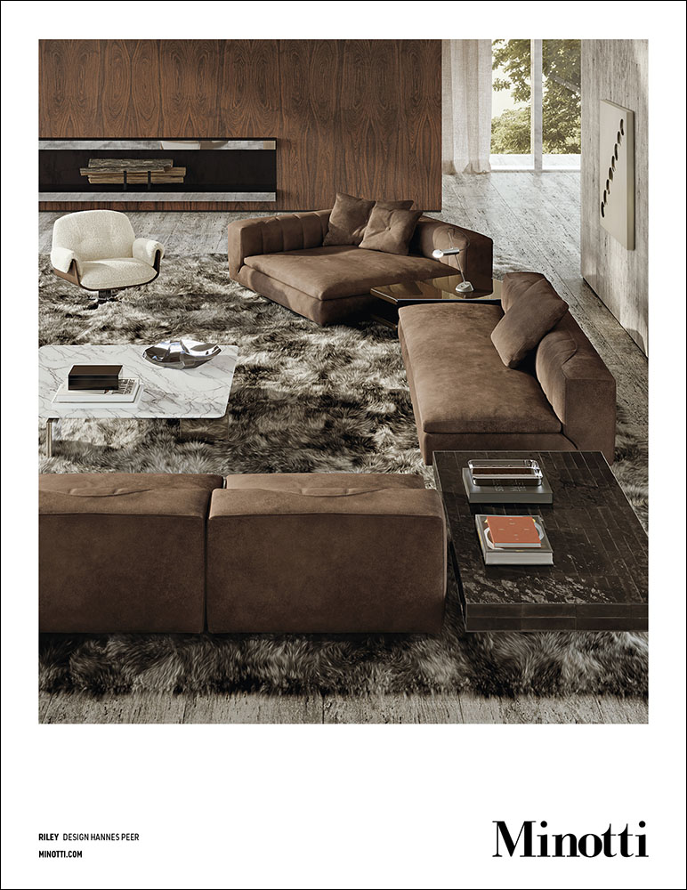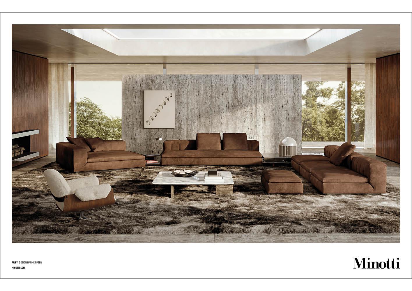 Riley, de Hannes Peer, se integra en una casa moderna de estética atemporal, expresión típica del lenguaje estilístico de Minotti, e introduce marcadas líneas geométricas, ricas en detalles sartoriales, que exploran los límites de un modernismo contemporáneo, en constante diálogo entre memoria e innovación.