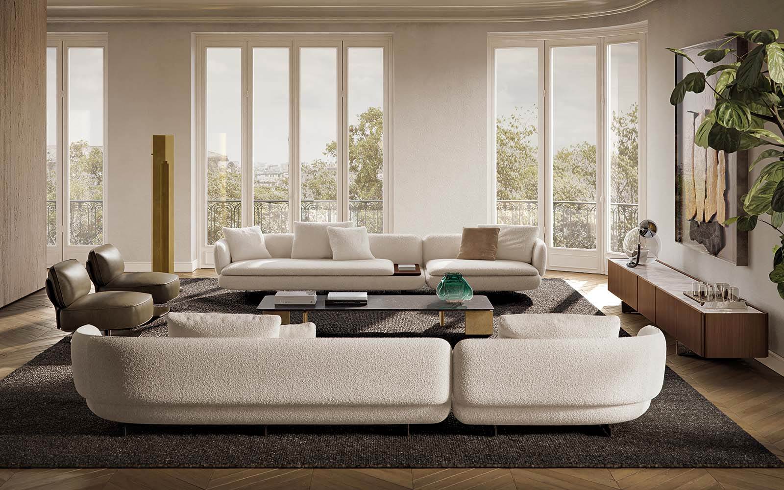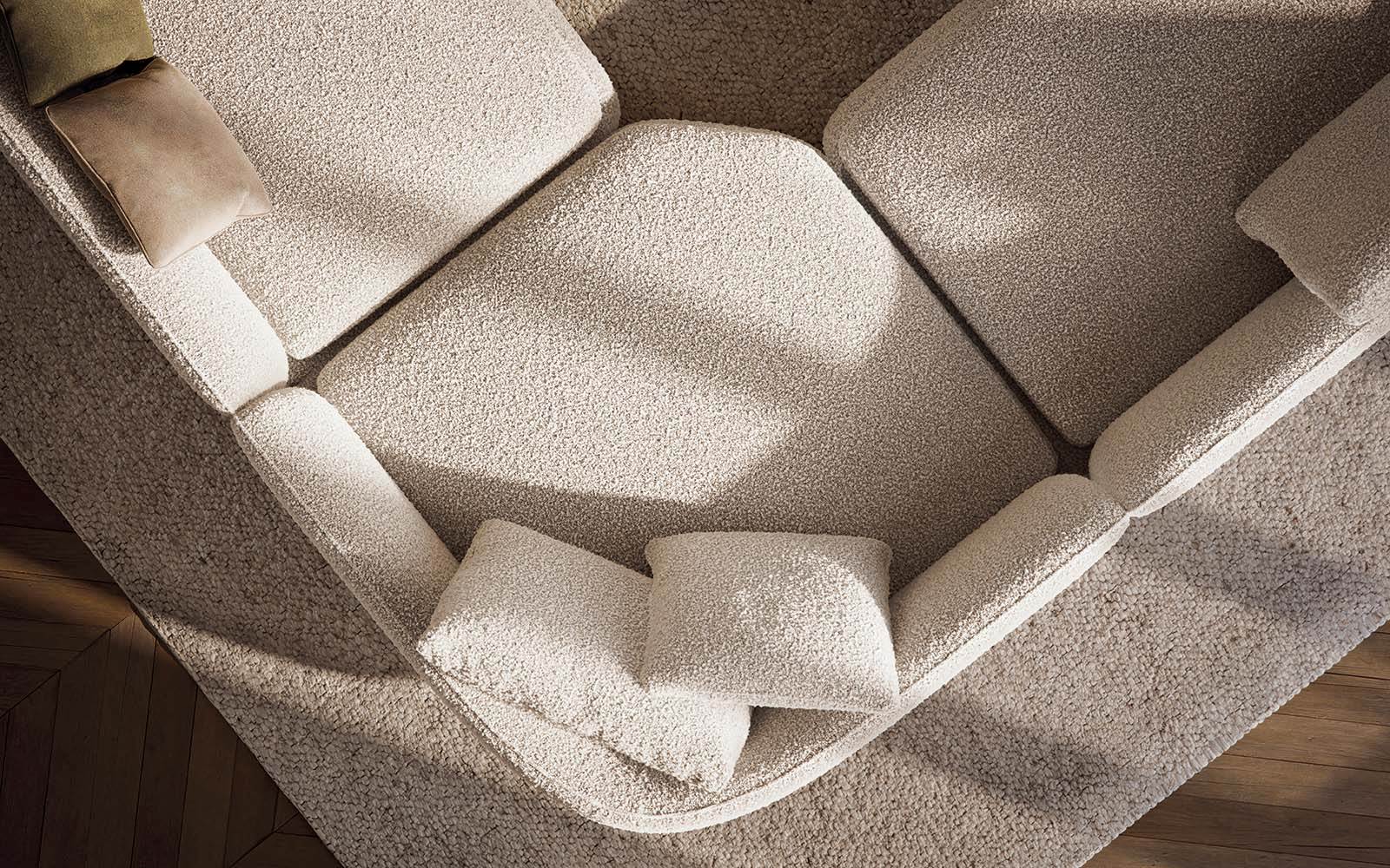 Vivienne es un sistema con una gran versatilidad compositiva. Además de sofás, módulos finales y chaise longues, también incluye elementos con superficies de apoyo, creando así combinaciones originales y un estilo coherente para ambientes de diferentes tamaños.