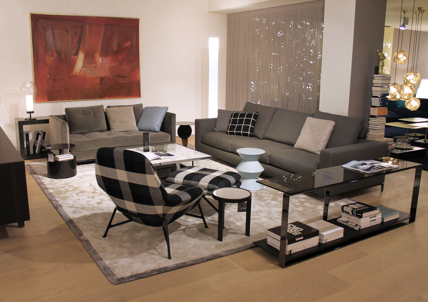 Le rez-de-chaussée du showroom accueille des mises en ambiance raffinées présentant les produits les plus représentatifs de la Collection 2014, comme le système de sièges Leonard flanqué de fauteuils Aston “Cord” Indoor et d’une petite table Benson, et quelques éléments – le canapé et les fauteuils – de la série Aston. L’installation, qui comprend également des best-sellers comme les canapés Hamilton et Powell, constitue une présentation vraiment complète et actuelle de la collection Minotti.