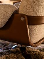 Se distinguant par sa forte personnalité, le dos du fauteuil est enrichi d’une bande en tissu ou en cuir, évoquant une martingale, en correspondance de deux clous en métal précieux, placés sur les côtés de la coque, également présents dans la version fauteuil.