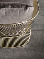La costruzione della poltrona Colette presenta una natura piuttosto complessa. Il profilo della struttura esterna in metallo viene calandrato, assemblato e saldato in oltre trecento punti. La speciale finitura metallica è ottenuta con un processo di galvanizzazione in un bagno d’oro chiaro e una vernice protettiva trasparente, che conferiscono resistenza e profondità. La struttura della seduta termina nella parte anteriore con un appoggio a terra ed è realizzata con una schiuma poliuretanica con inserto in metallo, dotato di cinghie e reso elastico per garantire il massimo comfort. Cuscini di seduta e schienale sagomati consentono un perfetto inserimento nella struttura.