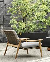 La poltrona e le poltroncine Fynn Outdoor sono caratterizzate da un’estetica di grande leggerezza con una struttura essenziale in teak, con telaio intrecciato da corde effetto midollino di colore Fango che accoglie il cuscino imbottito di seduta e schienale, concepito come un unico elemento. Il rigore informale con cui Fynn Outdoor ospita l’elemento imbottito disegna una seduta comoda e confortevole.