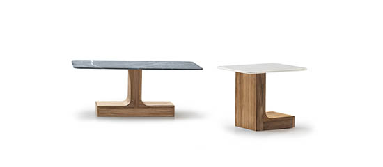 Anche i tavolini hanno come comune denominatore il design del bracciolo in legno che disegna una curva poco accentuata ripresa nelle parti laterali stondate del piano. La parte centrale del tavolino è arricchita dalla presenza del top in Pietra del Cardoso, che crea una ricercata combinazione di materiali.