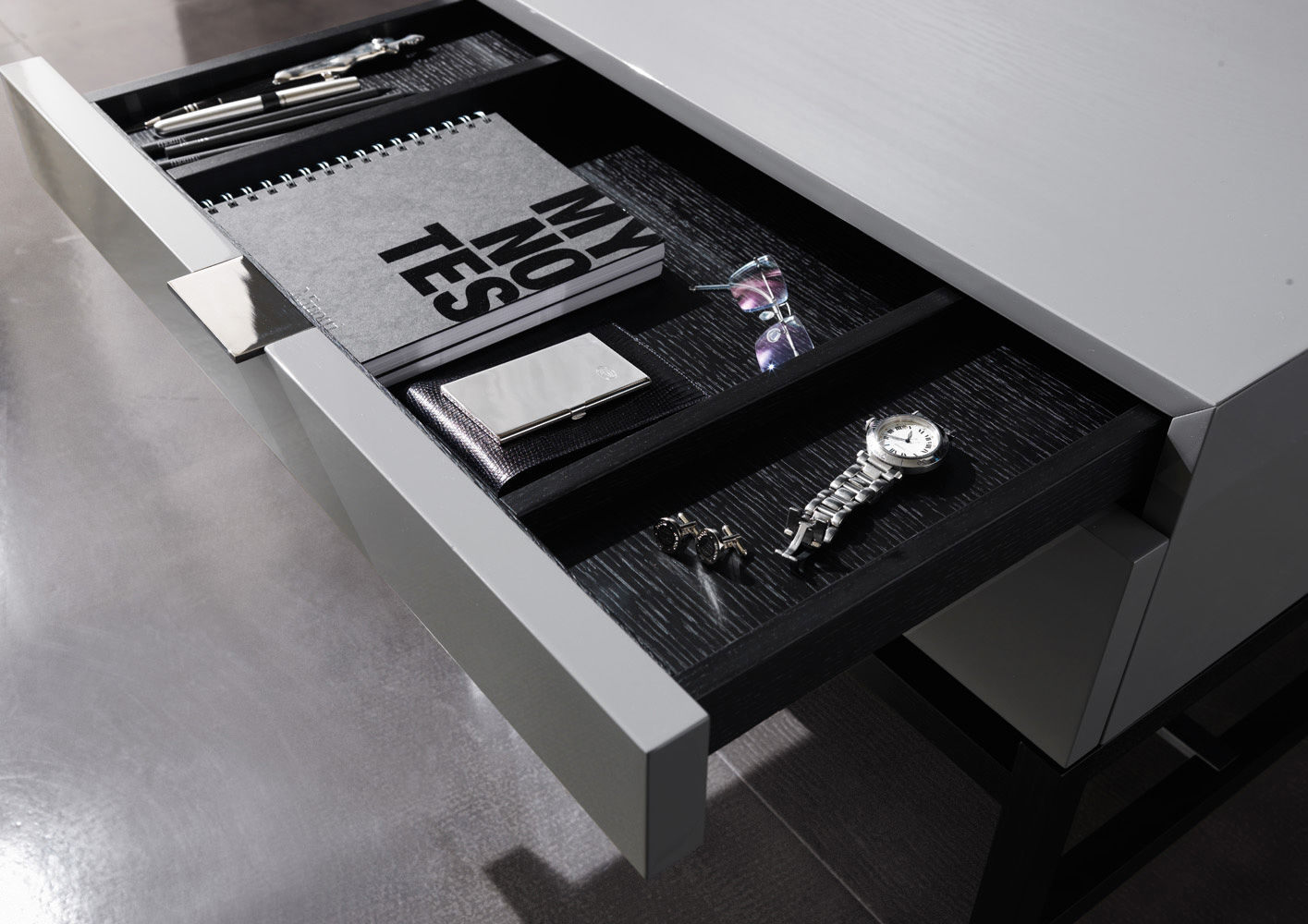 Harvey si presenta come una perfetta fusione tra tradizione e modernità, con una base in essenza, di colore Moka, che contrasta con i contenitori laccati lucidi e sofisticati dettagli in metallo con finitura Black-Nickel.