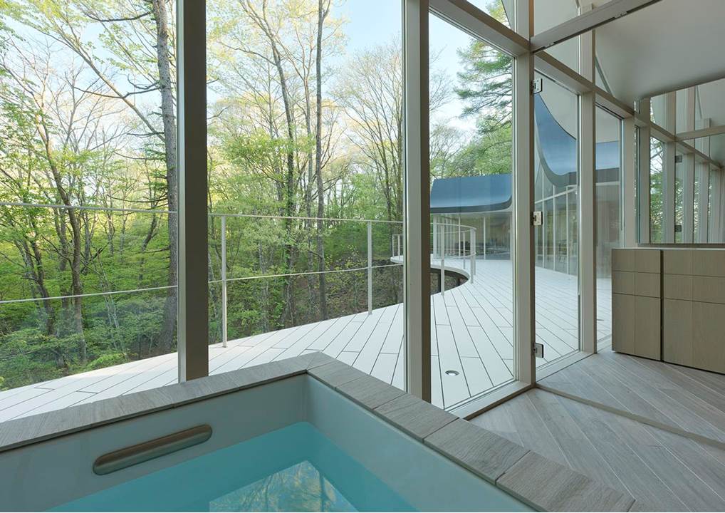Collegati da un tetto nero, sinuoso e scultoreo, e da una terrazza in legno che si integra perfettamente con il verde lussureggiante circostante, i cottage misurano 20 m² ciascuno e sono posizionati in modo da garantire privacy ed unione al tempo stesso, richiamando l’architettura tradizionale giapponese.