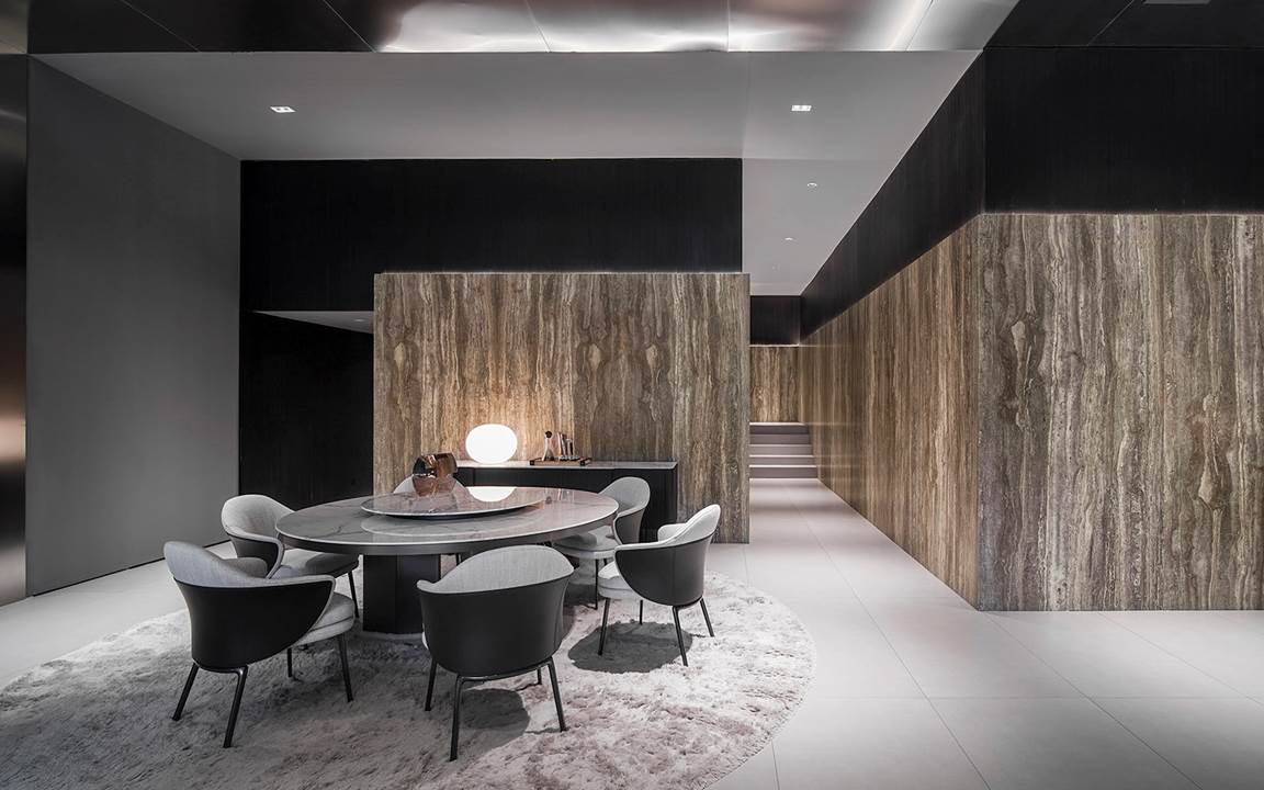 Il progetto di interior a cura di Minotti Studio restituisce ambientazioni dal mood contemporaneo, dove ogni dettaglio è curato con attenzione sartoriale e spicca in un equilibrato gioco di contrasti: le boiserie lineari o curve in rovere Wengé conferiscono un’atmosfera calda,  alternandosi a pareti in Travertino, pilastri in acciaio inox spazzolato e pavimentazione nella tonalità cemento, per una palette cromatica nelle sfumature del grigio che esprime grande raffinatezza.