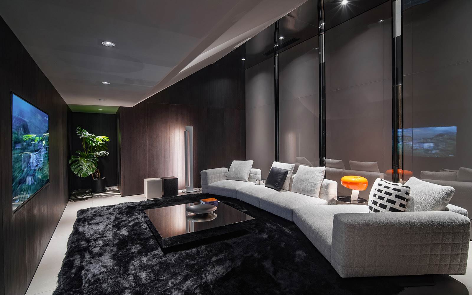 Il piano terra si suddivide sapientemente in tre aree: un’ampia zona living, animata dall’iconico camino sospeso, ospita il sistema di sedute modulari Dylan a firma Rodolfo Dordoni, la famiglia di sedute Torii Bold di Nendo e il mobile contenitore Superblocks di Marcio Kogan / studio mk27; l’area adiacente, più raccolta, è dedicata invece al mondo notte e accoglie le linee sinuose della famiglia Raphael di GamFratesi. Il percorso immersivo prosegue infine con un’inedita zona movie theatre, pensata come un vero e proprio “cinema domestico”.