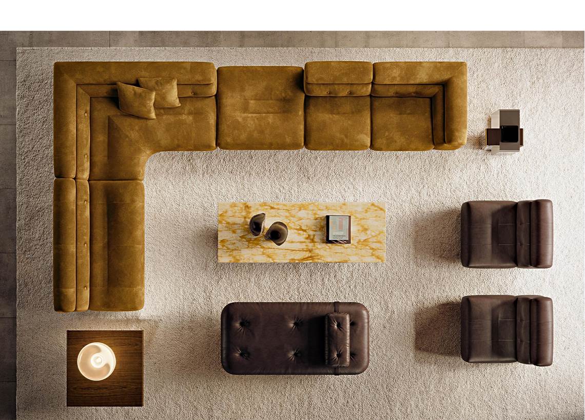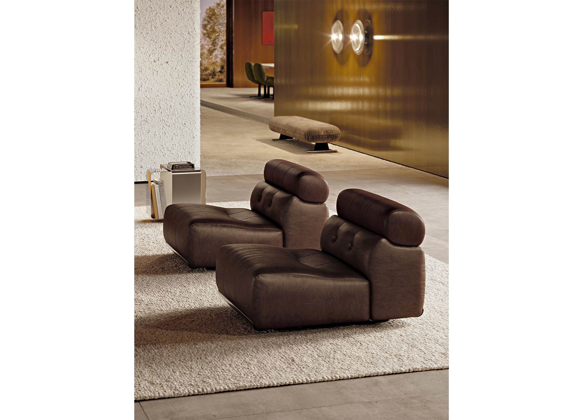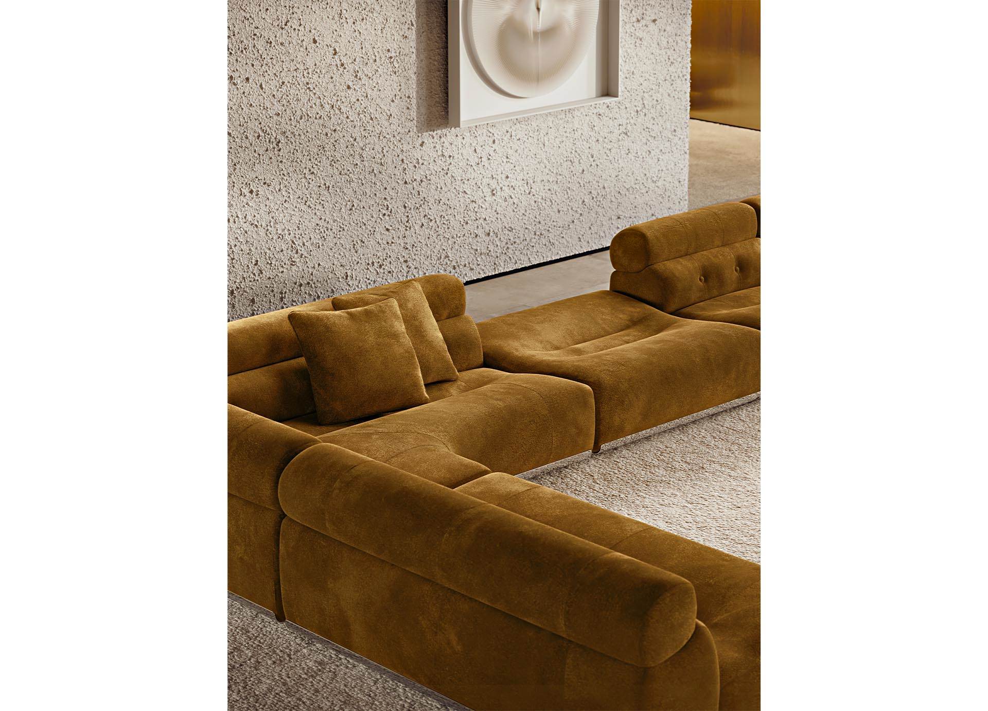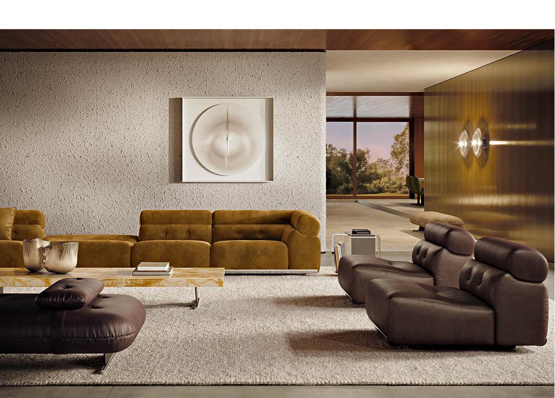 「このデザインの根底にあるのは、過去への深い敬意であり、ソファが、傾斜したシートで体を包み込み、魅力的な外観と比類なき座り心地を人々にあたえていた時代へのオマージュなのです」とタリアフェッリは話します。このシステムは幅広いラインナップが特徴で、シーティングエレメントを組み合わせることも、個々のエレメントを単独で使用することもでき、フレキシブルなレイアウトを無限に作り出すことが可能です。中でもひときわ目を引くのが、二段傾斜シートが特徴的なゆったりとしたプロポーションのカウチです。張地ベースの前面と背面にあしらわれた湾曲アルミフレームは、塗装仕上げと鏡面光沢仕上げがあり、このシステムの個性的なデザイン特徴となっており、カバーリングを保護しながら全体のシルエットを引き立てています。
