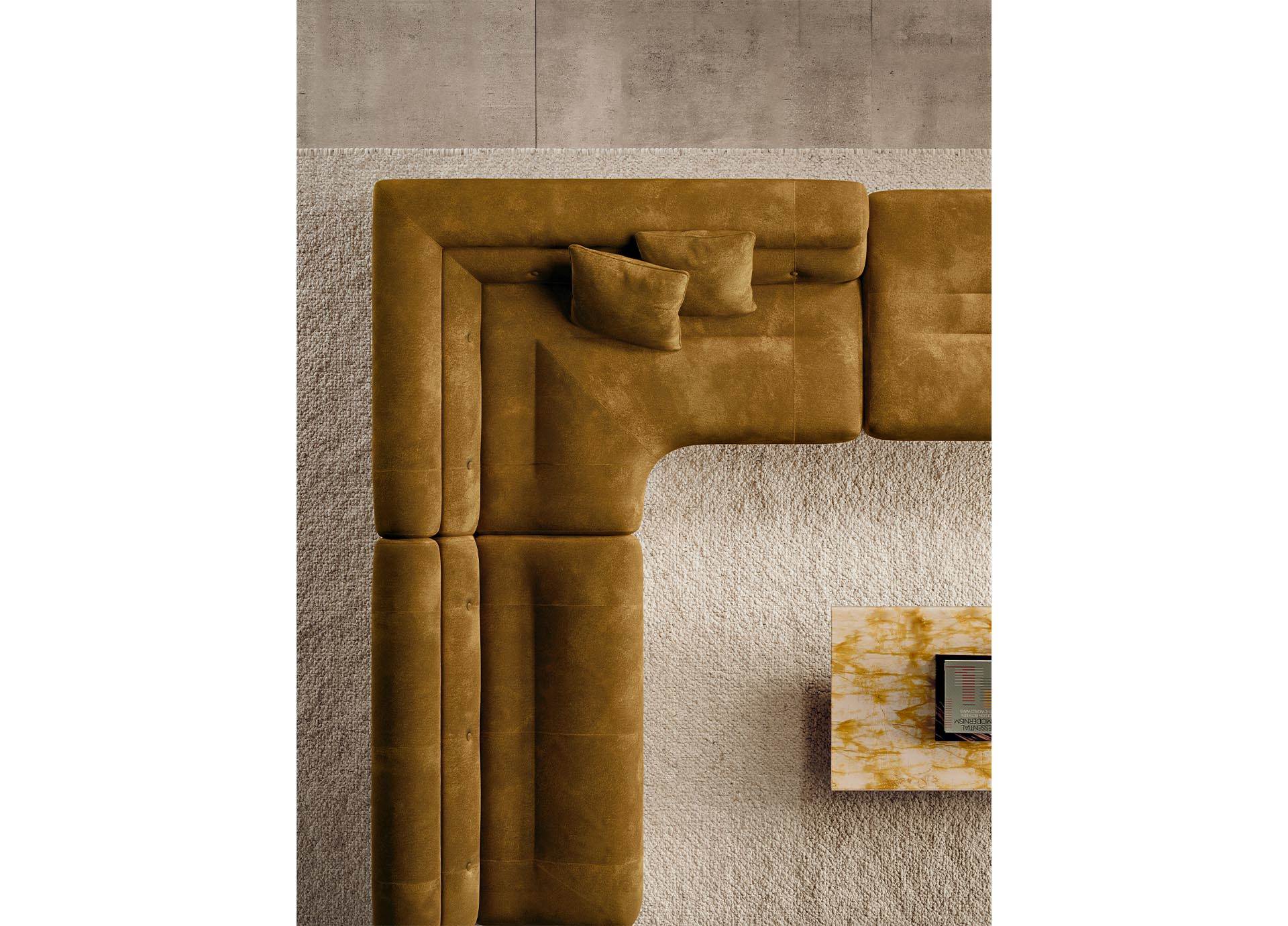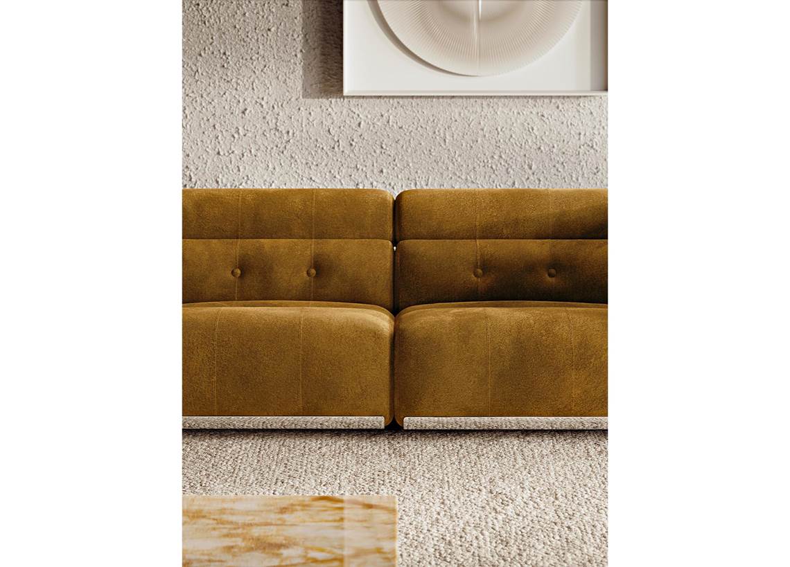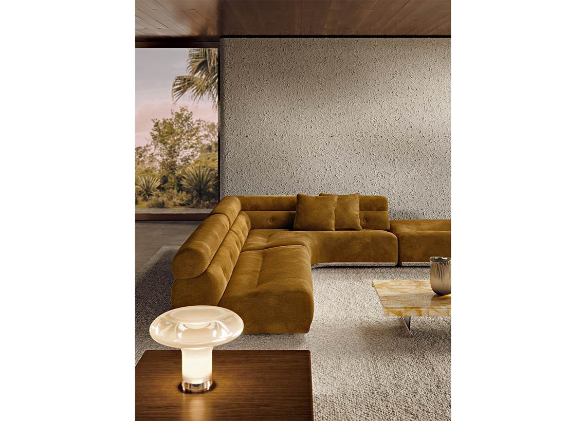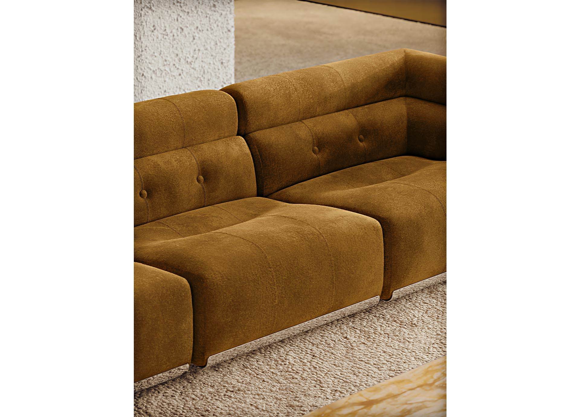 「このデザインの根底にあるのは、過去への深い敬意であり、ソファが、傾斜したシートで体を包み込み、魅力的な外観と比類なき座り心地を人々にあたえていた時代へのオマージュなのです」とタリアフェッリは話します。このシステムは幅広いラインナップが特徴で、シーティングエレメントを組み合わせることも、個々のエレメントを単独で使用することもでき、フレキシブルなレイアウトを無限に作り出すことが可能です。中でもひときわ目を引くのが、二段傾斜シートが特徴的なゆったりとしたプロポーションのカウチです。張地ベースの前面と背面にあしらわれた湾曲アルミフレームは、塗装仕上げと鏡面光沢仕上げがあり、このシステムの個性的なデザイン特徴となっており、カバーリングを保護しながら全体のシルエットを引き立てています。