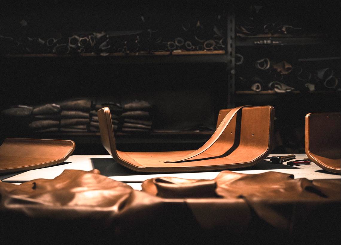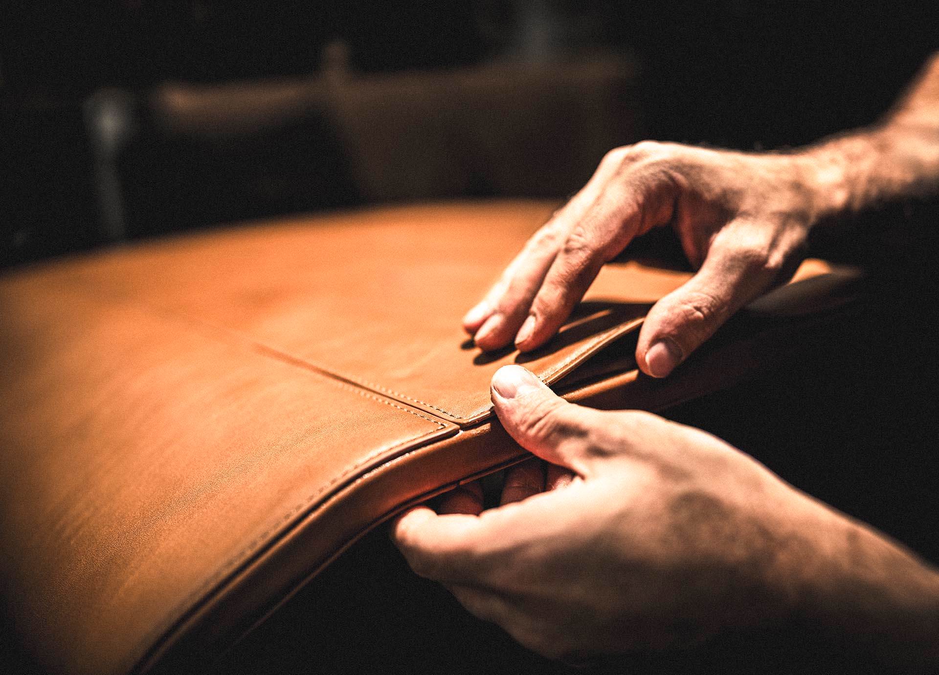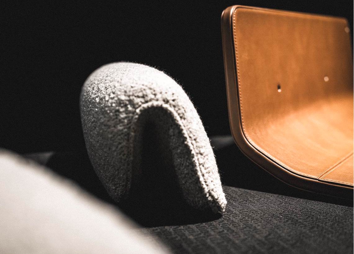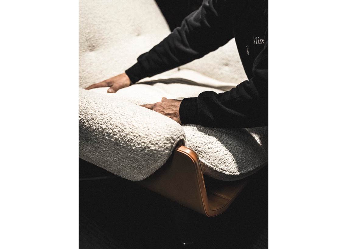 ウッドまたはレザー張りから選べるシェルは、サルトリア仕上げのディンプルディテールがリズムを刻むシートクッションとバックレストクッションを収納し、アームレストのソフトなクッションを支えるように上方にせりあがっています。