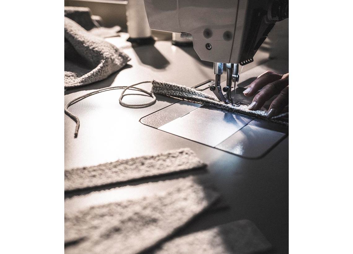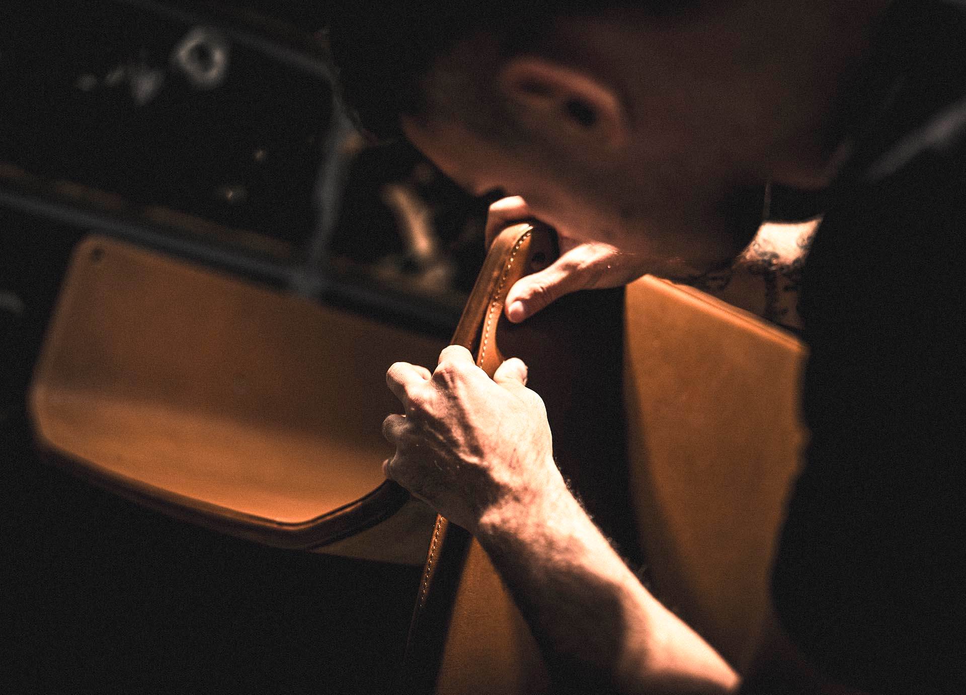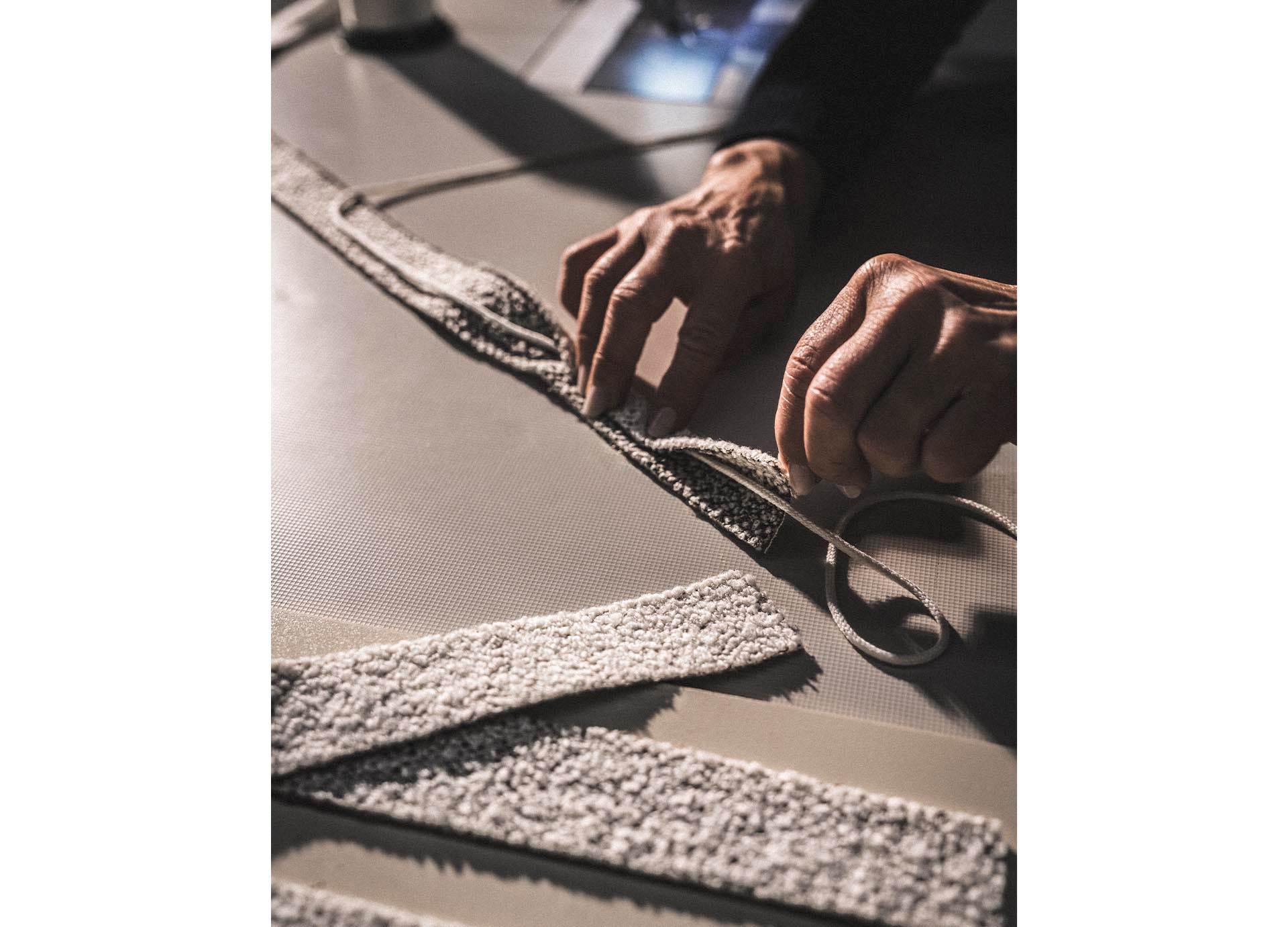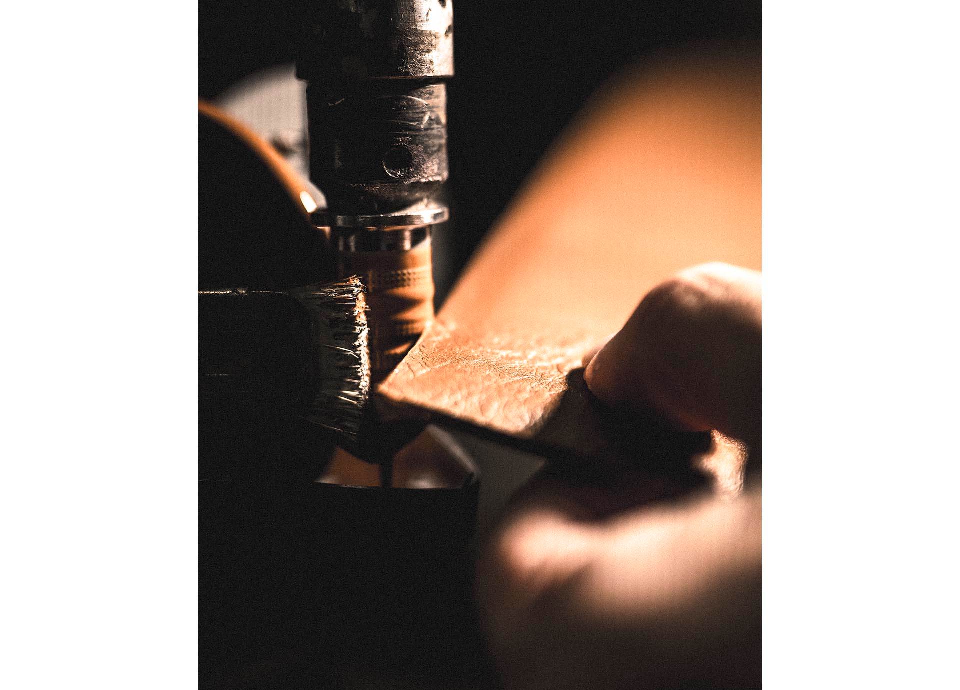 Laurelのエレガンスの背後には、職人の動きや音が織りなす、ミノッティの洗練された製造ノウハウが息づいており、それらがクラフツマンシップの工程のリズムを刻んでいます。レザーバージョンでは、高級レザーグッズの技法を用い、構造全体を覆うレザーパーツを巧みに組み合わせ、極めて高い精度の縦ステッチで接合し、テーラードトップステッチで仕上げています。