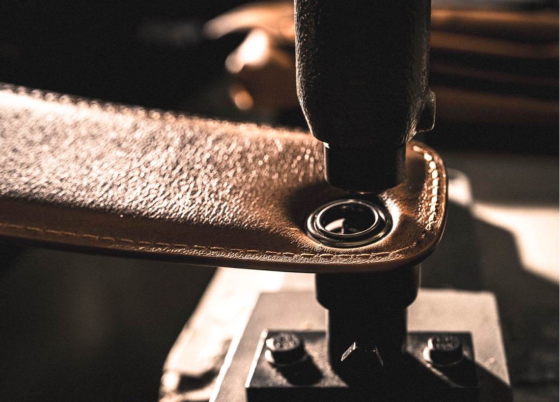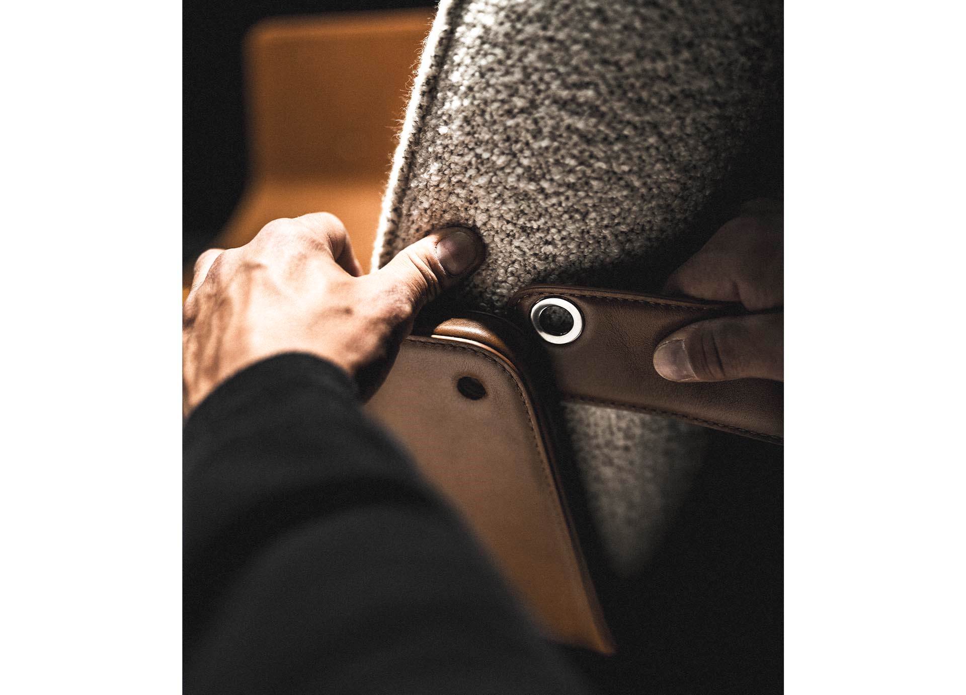強烈な個性を放つアームチェアのバックサイドには、マーチンゲールのようなファブリックまたはレザーのバンドが渡され、シェル側面にあしらわれた2つのメタルスタッズがアクセントになっています。メタルスタッズはスモールアームチェアバージョンにも付いています。