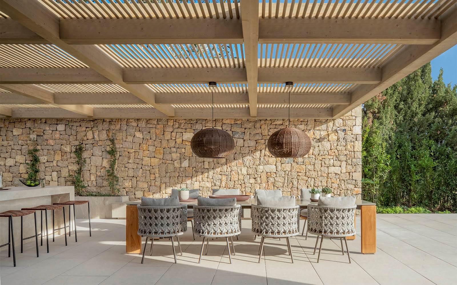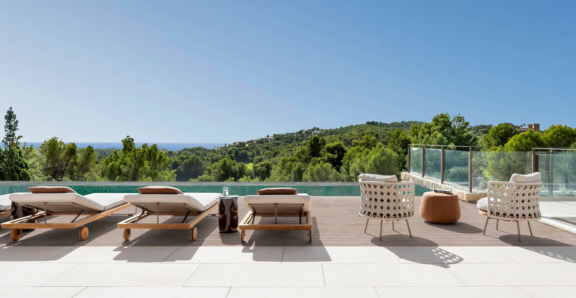 ダイニングテラスには、ハンネス・ピールのDrake Dining Outdoorテーブルに、nendoのTorii Nest Outdoorダイニングアームチェアを組み合わせて配置し、プールサイドでは、ロドルフォ・ドルドーニのSunrayサンラウンジャーとPilotis Outdoorコーヒーテーブルがリラクゼーションエリアを演出します。