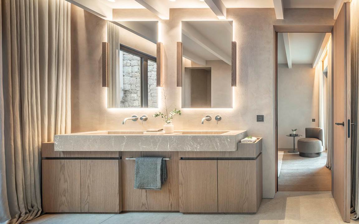洗練された仕上げと、自然からインスピレーションを得たカラーパレット(地元産の石、明るい色の木材、温かみのある色調のサーフェイス)が、このプロジェクトのアイデンティティを決定づけています。内と外の境界をなくすフルハイトウィンドウから注ぎ込む自然光もまた、このレジデンスのもう一つの主役です。