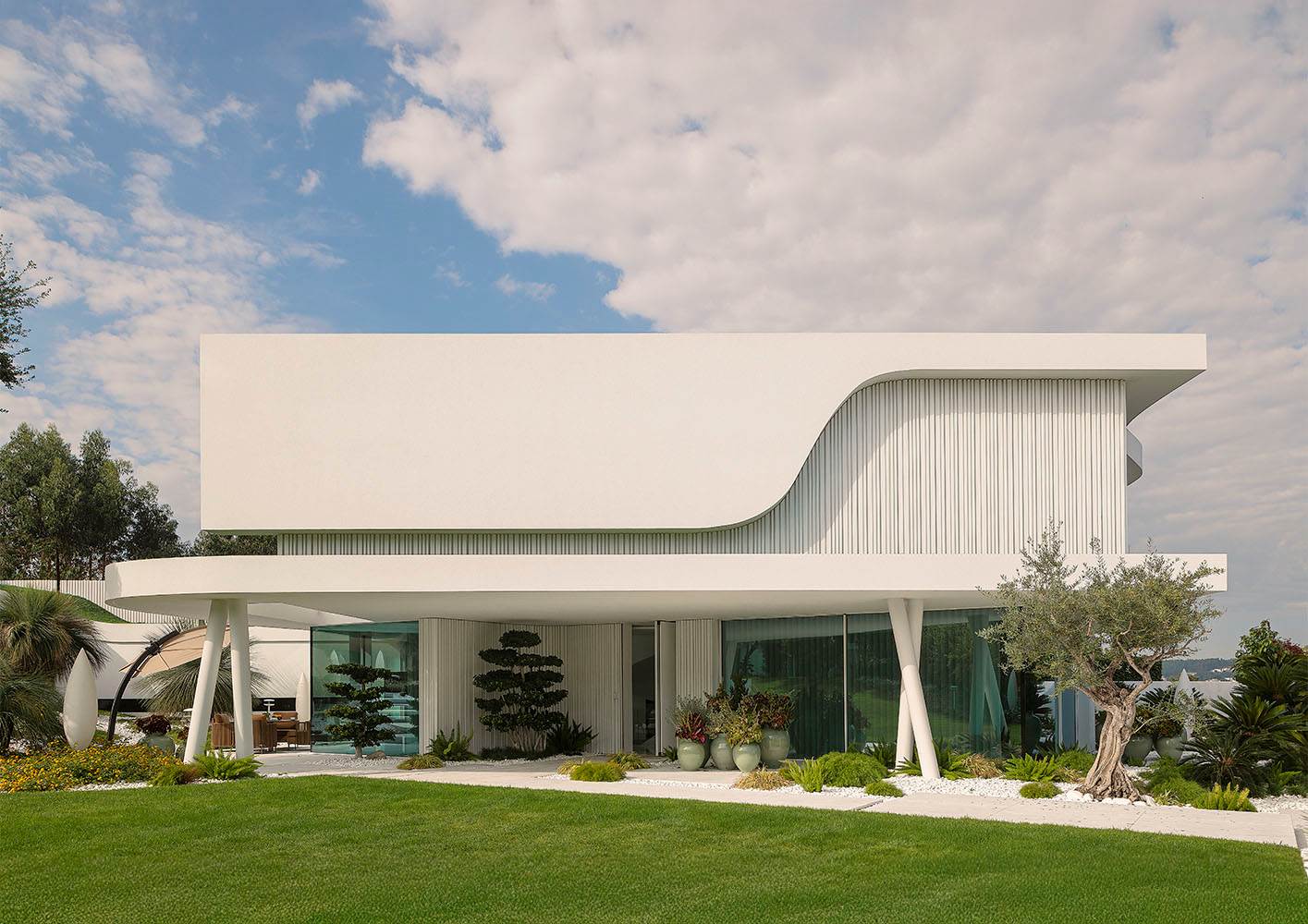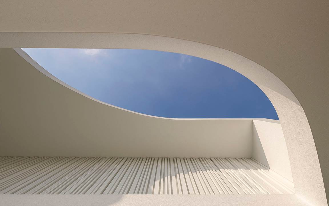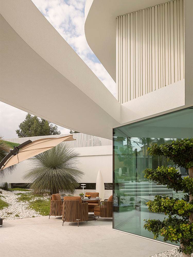 このヴィラは、白を基調にした、2階建ての水平構造を特徴とするモダンでミニマルな建築が異彩を放ちます。フルハイトウィンドウが、室内と屋外の境界をなくし、空間の連続性の知覚を増幅させています。