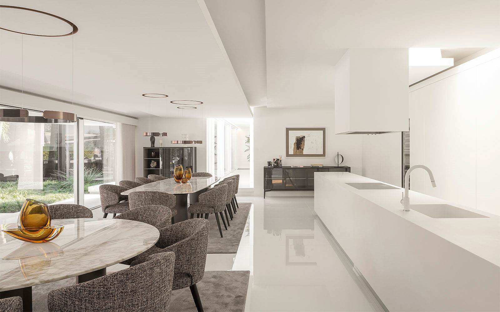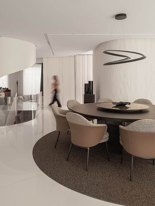 ダイニングエリアは、接客や団らんのための空間としてデザインされ、その中心にはロドルフォ・ドルドーニのMarvinテーブルが、ガムフラテーシのAngieダイニングスモールアームチェアとともに配置されています。
