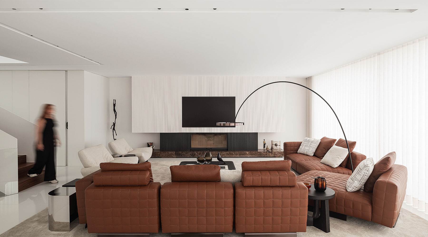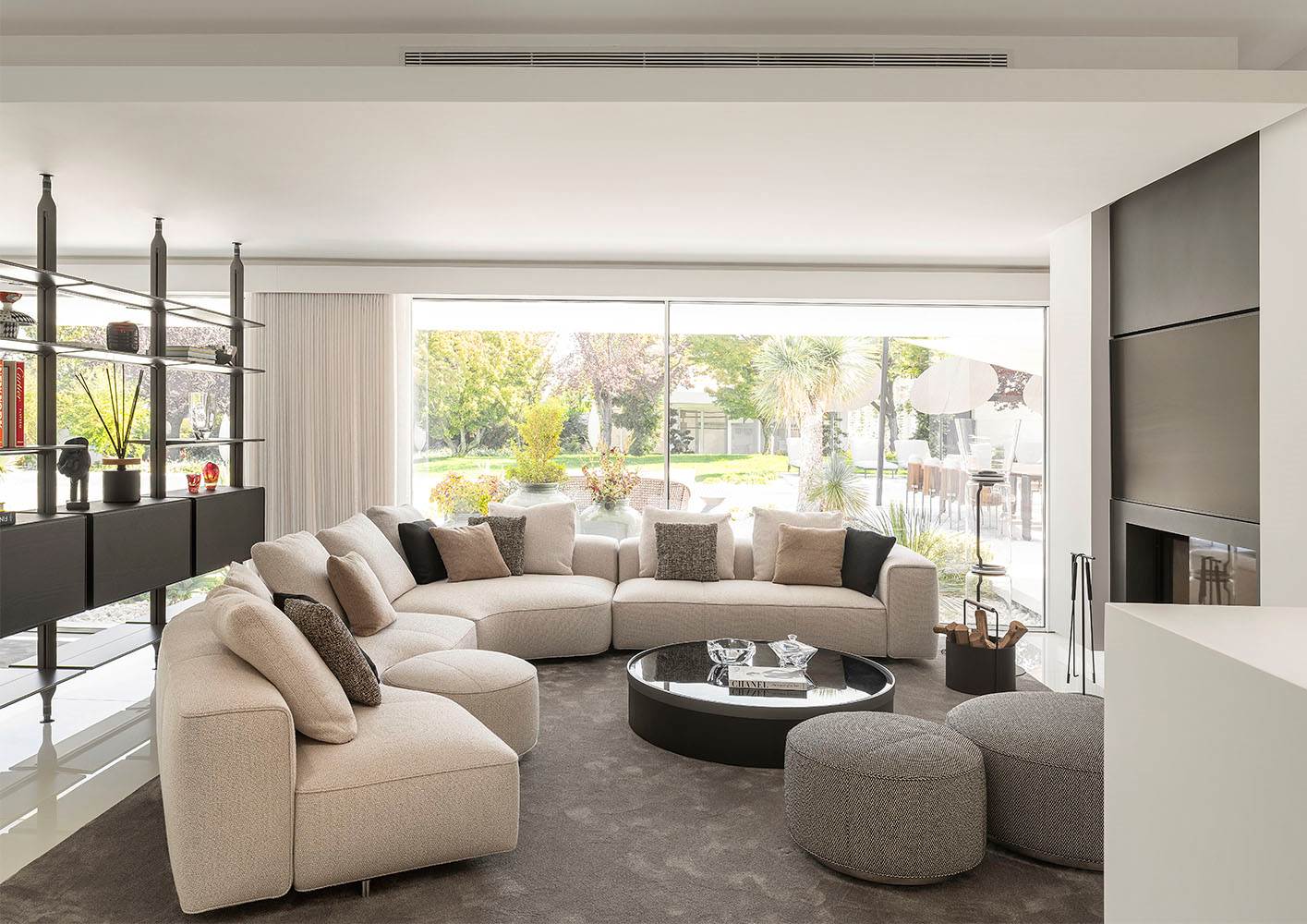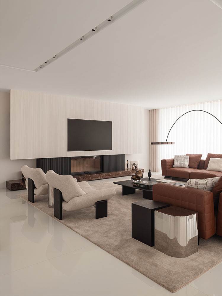 広々とした明るいメインリビングルームは、団らんのための空間として設計されています。ロドルフォ・ドルドーニのTwiggyシーティングシステムが、上品な飾りステッチをあしらったクオイオ色のゆったりとしたコンフィギュレーションでセレクトされ、ハンネス・ピールデザインのEmmiアームチェアと並べて配置することで、包み込むような雰囲気を醸し出しています。その隣には、円錐形の大きな吊り下げ式暖炉が置かれ、視覚的にも象徴的にもこの空間のセンターピースとなっています。