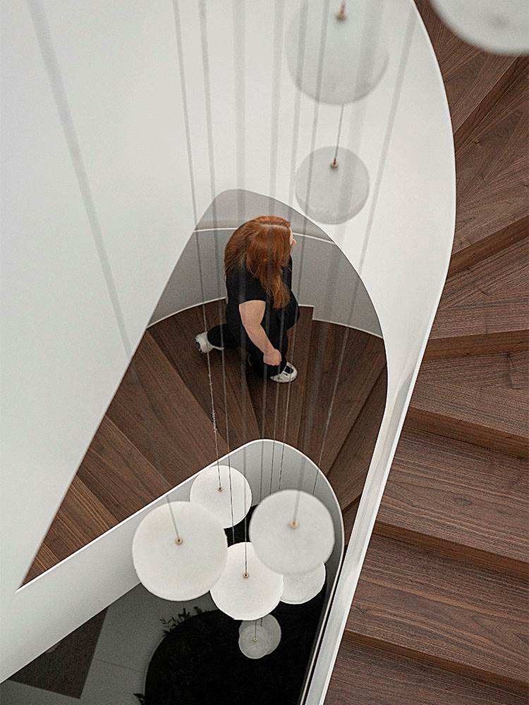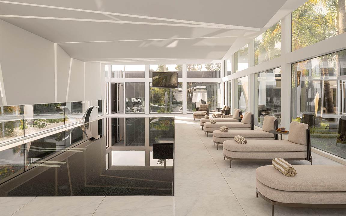 離れでは、ロドルフォ・ドルドーニのPilotisコンソールが迎え、室内へといざないます。ハンネス・ピールのYvesシーティングシステムが主役のセカンドリビングは、コンテンポラリーラウンジとしてデザインされ、暖炉を隔ててつながるダイニングルームには、nendoのWedgeテーブルとロドルフォ・ドルドーニのAstonダイニングスモールアームチェアが配置されています。落ち着いたシンプルさが特徴的な隣接するスパエリアでは、nendoのTape Cord Outdoorパオリーナが、ウェルネスのためのアルコーブを作り出しています。