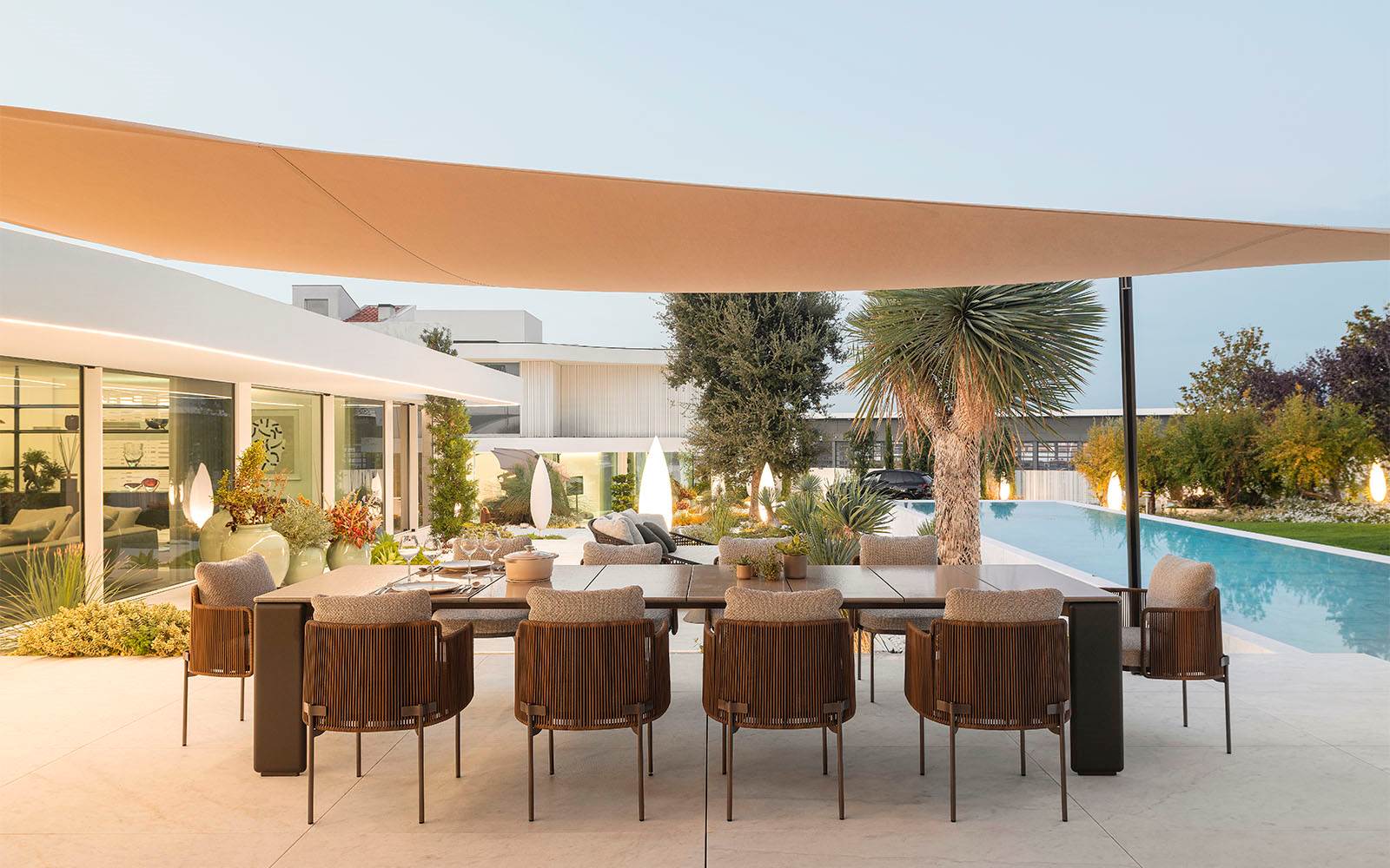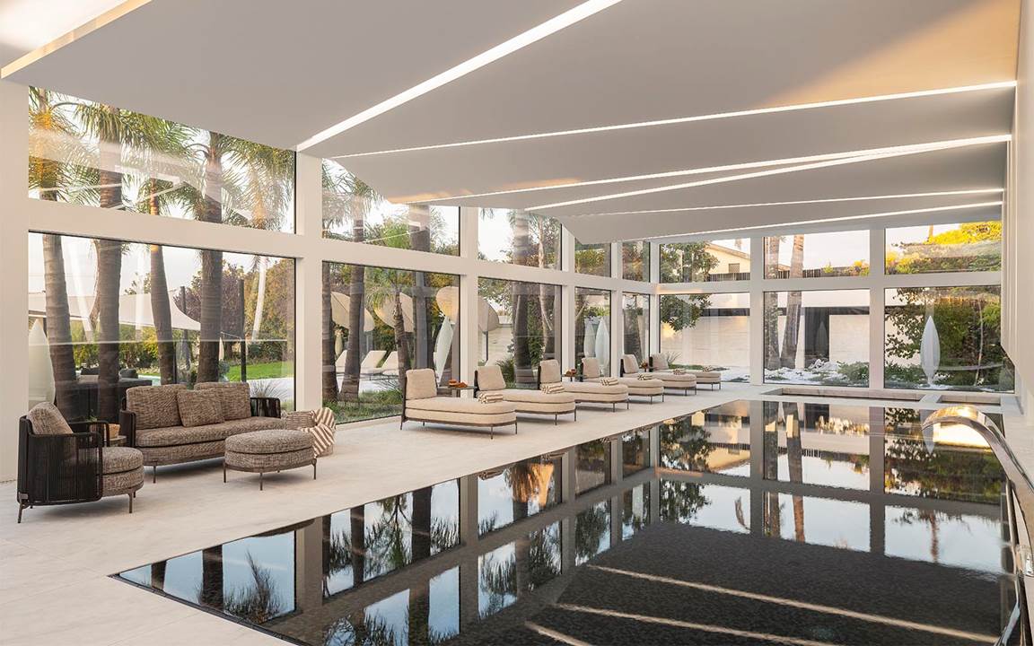 屋内プールと屋外プールは、インドアとアウトドアのつながりを際立たせるこのプロジェクトの重要な要素となっています。屋内プールに沿って置かれた、nendoのTape Cord Outdoorシーティングシリーズが、落ち着いたリラクゼーションエリアを演出しています。屋外には、ロドルフォ・ドルドーニのAston Cord Outdoorラブシートや、オープンエアダイニングを構成するハンネス・ピールのDrake Dining Outdoorテーブル、nendoのTape Cord Outdoorスモールアームチェアが置かれ、この邸宅の魅力を引き立てています。