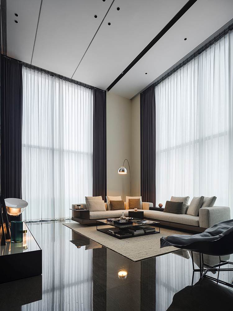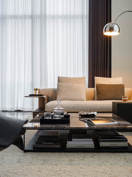 この360平米のフラットは、中国の武漢市中心部に位置する複合施設であるRongchuang Center No.1のレジデンス内に入っています。インテリアデザインは、施設全体のコンテンポラリーな雰囲気に合わせたスタイルでありながら、快適で調和のとれた仕上がりで、洗練されたディテールがふんだんにあしらわれています。ロドルフォ・ドルドーニデザインのモジュラーシステムConneryが、この空間の絶対的主役です。アメリカのミッドセンチュリーの精神を現代的な魅力で表現し、上質な素材と、Minottiらしい洗練されたサルトリア仕上げが引き立ちます。広々としたコーナーコンポジションには、同じくロドルフォ・ドルドーニによるLiamローテーブルが配置されています。無駄を省いたラインが、贅沢な素材をまとうこのテーブルは、そのスリムな本体フレームにピューター色のスチール、天板にオロビコグレー大理石を使用しています。