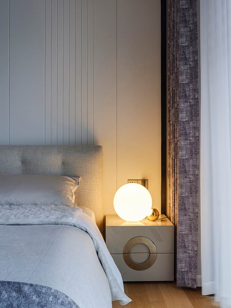 光沢仕上げの床からの反射も加わって生み出される、リビングエリアの心地よい明るさは、温かみのある寄木張りのフローリングを施したナイトエリアに入ると、わずかにトーンダウンします。マスターベッドルームには、ヘッドボードに繊細なキルティング模様を施したAndersen Bed "Quilt"と、ロドルフォ・ドルドーニデザインのArchipenkoサイドテーブルが置かれ、そのブラックニッケル仕上げのメタルハンドルが、グラフィカルな個性を空間に与えています。