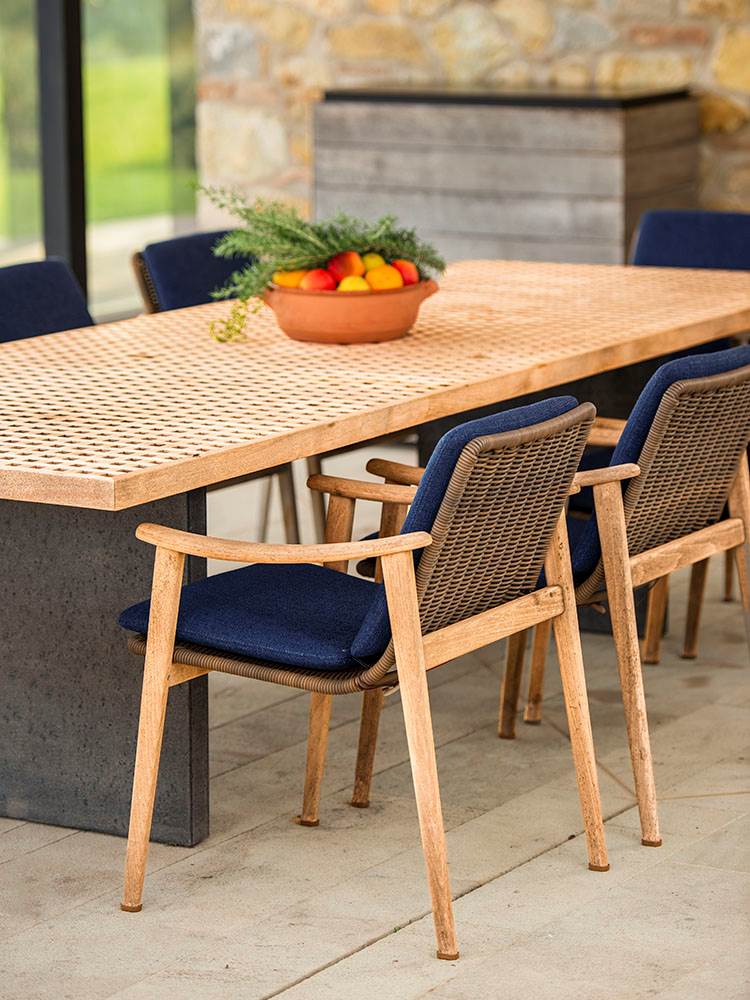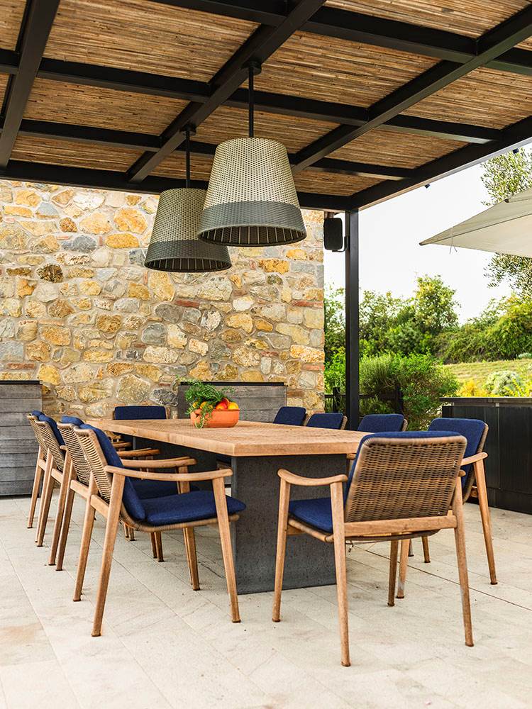 団らんの中心的スペースとして設計されている屋外ダイニングエリアは、ダークメタルの堅固なパーゴラの下に配置され、石造りの外壁の素朴さとバランスの取れた対話を実現しています。このエリアの主役は、マルシオ・コーガン / Studio MK27がデザインしたQuadradoテーブルと、ガムフラテーシのFynn Outdoorダイニングスモールアームチェアで、カジュアルな語らいのひと時にゲストを迎え入れます。