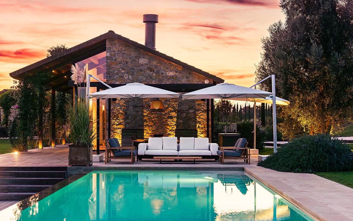 PB Farmhouseプロジェクトは、トスカーナ州マレンマ地方の丘陵地帯に広がる風景に溶け込む建築としてデザインされ、アウトドアリビングを、建築コンテクストとして、そして室内の自然な延長として解釈しています。こうして屋外エリアは、緑の中に深く組み込まれたエレガントでくつろぎ感にあふれた空間に仕上げられ、人間の造形物と自然との絶え間ない関係が育まれるようにデザインされており、調和の取れたフォルムと落ち着きのあるコンフォートが特徴のMinotti家具ソリューションによってさらに引き立てられています。