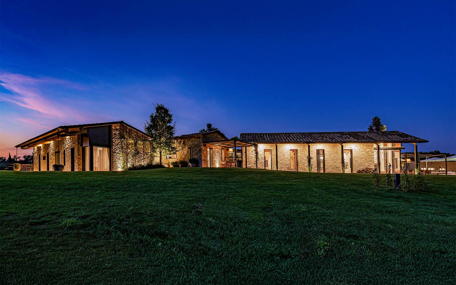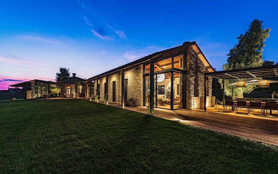 またセレクトされた建材が、この土地との結びつきを深めています。母屋の外壁には、現場で切り出されて手作業で仕上げ加工された地元産のコロンビーノ石を、一方、屋外舗装には、サンタフィオーラの石を用い、この地方の景観に合わせた伝統的素材使いによって、視覚的にも感覚的にも連続性をもたらしています。